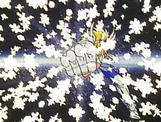 ya no lo está, por lo que se puede deducir que se descongela y se evapora. Es hielo. No parece que pueda albergar Cosmo ni nada por el estilo. Es similar a como Centaurus Babel creaba llamas a partir de fricción de aire, solo que lo opuesto. Es un fenómeno similar al caso de Iceman, el mutante de los X-Men... en áreas sin humedad de aire simplemente no tiene poder a pesar de que la habilidad que su mutación le da es tan natural en él como lo es caminar o correr... o como ocurre con Magneto en caso de estar en un lugar sin metal o sin magnetismo... Ya que los Santos de hielo detienen átomos, pues con solo que haya un objeto cerca quizá podrían utilizar su hielo aunque no hubiera humedad en el aire... ya que al detener los átomos de ese objeto automáticamente estarían generando hielo... también podrían usar la humedad de su propio cuerpo pero eso ya estaría medio raro xD Aunque un Saint de estas características no pudiera usar su hielo no estaría indefenso porque igual seguiría disponiendo de otras habilidades formidables... pero esta limitación sí que podría suponer un hándicap decisivo en el desenlace del combate o situación.
