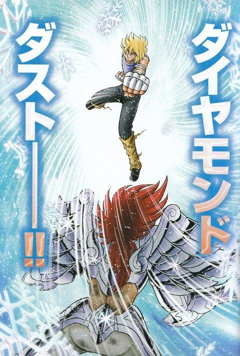 Inspiración: el Polvo de Diamante Se llama así a un fenómeno atmosférico en meteorología. Hyōga toma el nombre de ese fenómemo y se lo da a su técnica de ataque. El polvo de diamante es una nube compuesta de cristales de hielo muy pequeños. Este fenómeno meteorológico también es llamado simplemente cristales de hielo. El polvo de diamante generalmente se forma sobre un cielo limpio. Es más comúnmente observado en la Antártida y en el círculo polar Ártico, pero puede ocurrir en cualquier lugar con una temperatura muy por debajo del grado de congelación. En las regiones polares el polvo de diamante puede durar varios días, sin interrupción. El polvo de diamante es semejante a una niebla, sin embargo, se diferencia de esta por dos razones principales. Generalmente, el concepto niebla se refiere a una nube compuesta de agua líquida (la niebla de hielo normalmente se refiere a niebla que se formó como agua líquida y luego se congeló, y a menudo parece ocurrir en los valles por la polución transportada por el aire, como en Fairbanks, en Alaska, ya que el polvo de diamante se forma directamente como hielo). Además, la niebla es una nube bastante densa que reduce significativamente la visibilidad, mientras que el polvo de diamante suele ser muy fino y puede no tener ningún efecto en la visibilidad (hay muchos menos cristales en un volumen de aire que gotas de agua en el mismo volumen de niebla). Sin embargo, el polvo de diamante muchas veces puede reducir la visibilidad, en algunos casos a menos de 600 m (2.000 pies). La profundidad de la capa de polvo de diamante puede variar sustancialmente en los espacios mínimos, como 20 o 30 m (66 a 98 pies) hasta 300 metros (980 pies). Como el polvo de diamante no siempre reduce la visibilidad, muchas veces es notado primero por los breves destellos causados cuando los minúsculos cristales, que caen por el aire y reflejan la luz solar en nuestros ojos. Este efecto brillante da al fenómeno su nombre, ya que esos cristales de hielo asemejan a minúsculos diamantes brillando en el aire. Estos cristales de hielo por lo general se forman cuando se produce una inversión de temperatura en la superficie de la tierra, y el aire más caliente de las alturas se mezcla con el aire más frío de la parte inferior. Como el aire caliente a menudo contiene más vapor de agua que el aire frío, esta mezcla normalmente transportará al vapor de agua del aire cerca de la superficie, causando un aumento de la humedad relativa del aire cerca de la superficie. Si el aumento de la humedad relativa cerca de la superficie es suficientemente grande, entonces los cristales de hielo se pueden formar. Para formar el polvo de diamante la temperatura debe estar por debajo del punto de congelación del agua, 0 °C, o bien el hielo no se podría formar o se fundiría. Con todo, el polvo de diamante no se observa a menudo con temperaturas cercanas a 0 °C. En temperaturas entre 0 °C y aproximadamente -39 °C, el aumento de la humedad relativa puede producir niebla o polvo de diamante. Esto se debe a que las gotas de agua muy pequeñas pueden permanecer en estado líquido muy por debajo del punto de congelación, en un estado conocido como el agua superesfriada. En zonas con muchas partículas pequeñas en el aire, como polución humana o fuentes naturales de polvo, las gotas de agua probablemente serán capaces de congelarse a una temperatura de aproximadamente -10 ºC, pero en áreas muy limpias, donde no hay partículas (núcleos de hielo) para ayudar en la congelación de las gotas, estas pueden permanecer en estado líquido a -39 ° C, punto en el que las gotas de agua, por muy pequeñas y puras que sean, se congelarán. En el interior de la Antártida, el polvo de diamante es común en temperaturas por debajo de los -25 °C. En estos dos videos de youtube, podemos ver el fenómeno en impresionantes grabaciones realizadas en el extremo norte de Japón, en la isla de Hokkaido: