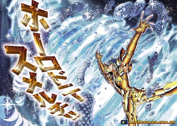 técnica de hielo según el Cosmo Special El usuario separa las piernas, junta las manos y eleva sus brazos por encima y detrás de su cabeza, los antebrazos de su Gold Cloth imitan una jarra dorada, mientras la representación del signo de Acuario aparece como fondo. Carga entonces su energía glacial en las manos. Cuando el ejecutor baja los brazos frente a su cuerpo hacia el objetivo proyecta al instante un chorro de energía fría / violento aire frío cercano al Cero Absoluto que ralentiza el movimiento de los átomos que todo lo que golpea, momento en el que los átomos cesan completamente de moverse, siendo capaz de congelar cualquier cosa que golpee. La corriente de aire frío mata al instante a aquel que la recibe, aunque el Specter Juez Minos de Grifo logró sobrevivir a su impacto. Se trata del ataque más potente basado en el dominio de la energía fría que Hyoga aprende y hereda de Camus durante las batallas de las 12 casas, , después de haberla visto sólo dos veces, directamente de la lucha con su maestro, en la que este murió. Hyôga la reprodujo por mimetismo durante su combate. Haciendo arder su Cosmo hasta el Séptimo sentido, Hyôga fue capaz de crear una ráfaga de viento frío inferior a las producidas con el Diamond Dust, el Hyoketsu Ring y el Aurora Thunder Attack, superando a su maestro, alcanzó verdaderamente el límite del Cero Absoluto, la temperatura extrema, el frío que hace en el espacio, siendo capaz de congelar a cualquier ser vivo o inanimado, cristalizándolo en el acto desde un nivel subatómico, pudiendo incluso congelar la hombrera de la armadura de oro de Acuario. Naturaleza: Física