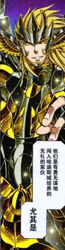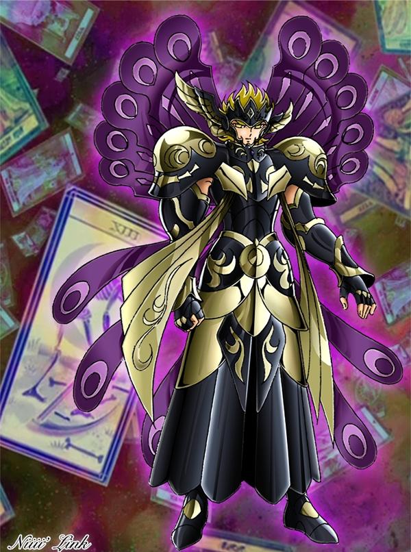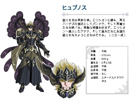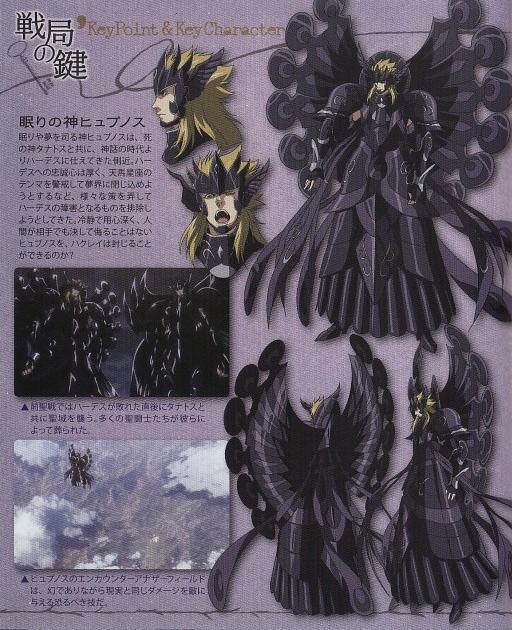Fanart de Juni Anker (Nicaragua) A pesar de su aspecto fanfarrón "conmigo no será tan simple como con Thanatos”, Hypnos es es desfavorizado e la trama una vez vistas sus aptitudes en el campo de batalla, tanto en el manga original como en el manga precuela Saint Seiya ~ The Lost Canvas, donde siempre es vencido más rápidamente que su gemelo. Un rasgo característico común es que, como lo recuerda el Taizen, aunque Hypnos no aprecia particularmente a los seres humanos, tampoco los detesta, a diferencia de Thanatos. Así, en Saint Seiya ~ The Lost Canvas Hypnos trata ciertamente de torturar mentalmente a Hakurei mediante chantaje poniendo en peligro las vidas de sus aprendices, pero se muestra al mismo tiempo interesado en ver la voluntad humana que habita en sus oponentes, y es con una sonrisa de felicitación que su cuerpo de empréstito es vencido, lo que conlleva el encarcelamiento de su alma. En el manga original, Hypnos muestra también que a pesar de su inmensa lealtad hacia Hades temía a este dios, y asesora a los Bronze Saints que detengan a Seiya antes de que despierte al verdadero cuerpo de Hades, preocupado de que este último no lo destruya todo. PARTICULARIDADES DE LA ARMADURA : Su Surplice no tiene ninguna especificidad conocida, a nivel de diseño es magnífica e imponente. En su forma object, el surplice toma la apariencia de una persona con alas parecidas a la cola de un pavo real, diseño extravagante que se adecúa con la personalidad mística del dios. En el diagrama del ropaje que aparece en el manga, encontramos la naturaleza de la armadura de Hypnos, es un Surplice: kanji : 眠りを司る神 ヒュプノス (Nemuri wo tsukasadoru kami Hypnos no Surplice). No es un Kamui. Los Kamui son mencionados por Hypnos en la última parte del manga, en el Hades Hen. Son los Cloths de los dioses. La confusión entre ambos términos viene de que traduciendo los kanji para God Cloth dice “Divino Manto Sagrado”. Los kanji de Kamui dicen “Manto de los dioses”, entonces de ahi se deriva la confusion. Aun en japonés te podrías confundir pues se escriben casi igual, sólo que God Cloth tiene un kanji más.