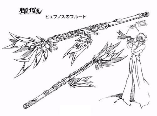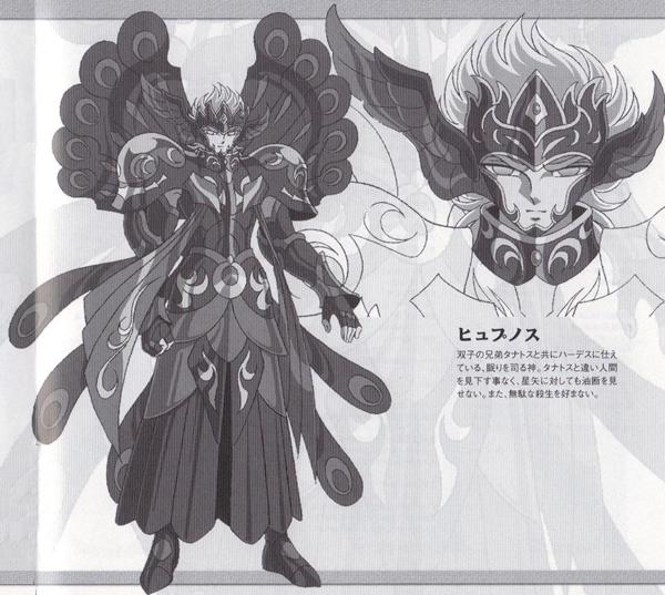 Fanart de Niiii'Link (Francia) Tal vez el elemento más distintivo de la armadura de Hypnos es el ala colocada en el lado derecho de su casco. Kurumada tomó esta idea de una famosa cabeza de bronce que representa al dios, justamente con sólo un ala en el lado derecho de la cabeza. Sin embargo, la pieza tenía originalmente alas iguales de cada lado de la cabeza, y una se rompió. Por el contrario, Kurumada creó la armadura de Thanatos con un ala en el lado izquierdo del casco. Fuera de eso, la "cola de pavo real" que se aprecia en la parte posterior de la armadura debe represenatr al pavo real de Hera, cuya cola estaba decorada con los ojos del monstruo Argos, adormecido en una trampa por Hermes para liberar a la princesa o ninfa Io, mantenida presa en la forma de una vaca (ver la ficha del general mariner Io de Scylla), y también el pasaje de la Ilíada en el que la esposa de Zeus llama al Dios del sueño (en realidad, Oniro y no Hypnos) para adormecer a su marido y así, ayudar a los griegos en la guerra de Troya sin la interferencia del señor de los dioses.