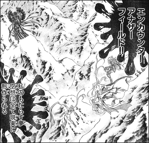 - Encounter Another Field (エンカウンタアナザーフィールド pron. jp. Enkaunta anaza firudo, "Encuentro de Otro Campo" o "Encuentro en otro lugar") (LC) Técnica derivada de la famosa expresión « los sueños de hacen realidad », convierte los sueños de sus oponentes en realidad. Los poderes de Hypnos le permiten, de alguna manera, materializar sueños e ilusiones. Transporta a sus víctimas hacia otro espacio y tiempo que aparenta ser un escenario de sueños. Hypnos es capaz de hacer reales sus ilusiones, y puede, por ejemplo, cambiar la ubicación del combate en cadena montañosa, puede así precipitar sus adversarios desde lo alto de un macizo montañoso con una altura de más de 10.000 metros, aunque antes se encuentren sobre el suelo, o proyectar meteoritos. Aunque las situaciones no parezcan reales, los desperfectos si que lo son. Esta técnica es muy peligrosa debido a su potencial casi ilimitado. HABILIDADES ESPECIALES : El poder divino de Hypnos le permite inducir a todo tipo de seres vivos en un profundo sueño, y que la víctima vuelva a despertar o duerma por la eternidad depende de su voluntad o capricho. Como dios del sueño, el atributo principal de Hypnos es la capacidad de inducir al instante a cualquier tipo de ser vivo en un profundo sueño. Siendo una deidad, es portador del "Big Will", el Cosmo divino de los dioses, de la misma manera que su hermano gemelo Thanatos, Hades y Poseidón. Su poder también tiene efecto sobre los seres divinos, ya que fue capaz de hacer caer a Atenea en el sueño para colocarla dentro de la sagrada ánfora de Elysion, que la mataria poco a poco al chupar toda su sangre. Tiene la capacidad de adueñarse y entrometerse en el sueño ajeno, de sumir a su oponente en sus peores pesadillas. Así como capacidades psíquicas y psícoquinesis. Al igual que su hermano Thanatos, es capaz de dar una fracción de su poder a otra persona, en el manga precuela Saint Seiya The Lost Canvas se ve a Pandora brevemente con la misma estrella hexagrama en la frente. No se muestran demasiado los poderes de Hypnos en comparación con su hermano Thanatos, pero es razonable suponer que son de niveles similares. Se podría incluso decir que Hypnos debe estar un poco por encima de Thanatos, porque se las arregló para luchar contra los Bronze Saints y sus God Cloths, mientras que Thanatos fue asesinado de un solo golpe, a pesar de que debe tenerse en cuenta la imprudencia de este último, mientras que Hypnos no subestima a sus oponentes. Esta confrontación demuestra que supera la velocidad de la luz. Volar en el aire es natural para él. Según el Taizen, Hypnos también dispone de grandes habilidades marciales, aunque no se le vea luchar cuerpo a cuerpo. En el manga precuela Saint Seiya ~ The Lost Canvas, Hypnos presta a Pandora una amapola que permite sumergir a un objetivo en el sueño, lo que funciona perfectamente con Alone cuando Hades no ha despertado aun en él al 100%. Hypnos dirige a Oneiros, Morpheus, Ikelos y Phantasos. Al igual que Thanatos, Hypnos utiliza un cuerpo de empréstito para encarnarse en la Tierra, y la eliminación del cuerpo hace que el alma lo abandone, sin disiparse, por eso esta es encerrada en una caja especial. En cambio, en el manga original se demostró que Hypnos realmente muere cuando su cuerpo real es sacrificado en Elysion.