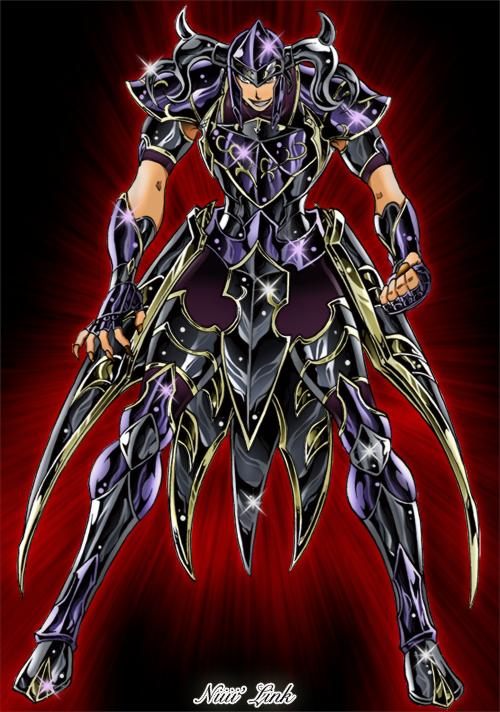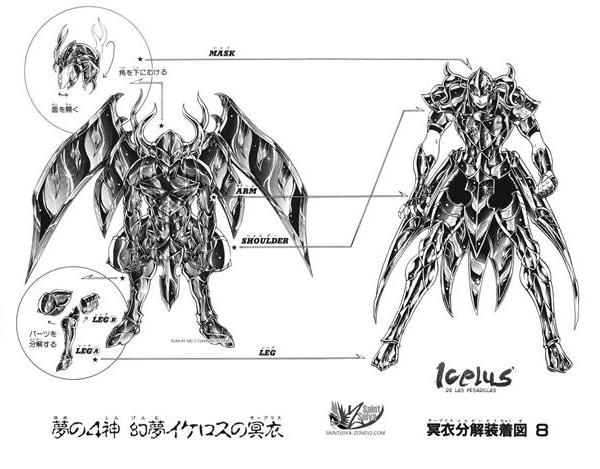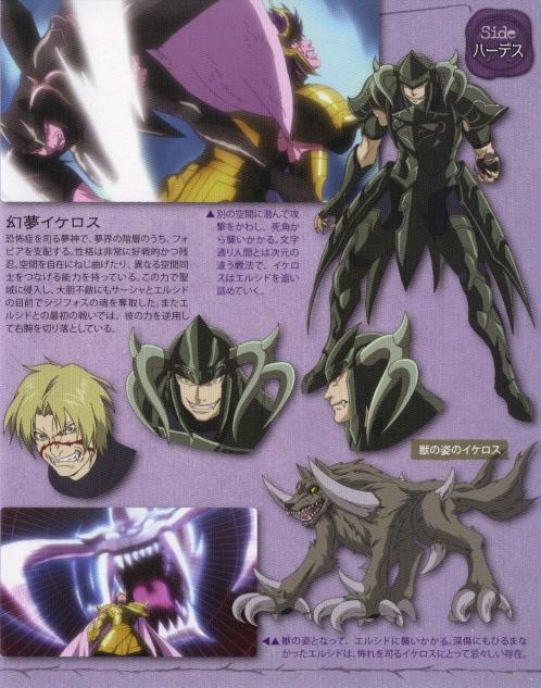 conocido por Phobetor, en griego, atemorizante. Ikelos no utiliza técnicas nombradas, pero es capaz de curbar a su discreción las dimensiones del espacio, lo que le permite devolver los ataques hacia aquellos que los han enviado o beneficiar de una movilidad sobrenatural en el campo la batalla. Su técnica de combate no tiene ningún nombre, por su naturaleza y efectos podríamos llamarla “distorsión de espacio” … por decir algo. Su poder es inmensamente interesante: pueden cruzar y cortar el espacio. Con ese poder, puede tanto atacar al enemigo inesperadamente por cualquier lugar, como hacer que sus propios golpes sean devueltos a sus adversario. La técnica de Icelos es útil tanto en defensa como en ataque, su deformación del espacio le permite evitar los golpes lanzados contra él y reaparecer donde le parece para contraatacar, a nivel ofensivo, con ese método devuelve los ataques lanzados contra él. Es de esta forma que el Cid se corta el brazo con su propio ataque de Excalibur. Hay que señalar que Icelos utiliza más a menudo la distorsión del espacio para desplazarse, pues para luchar utiliza sobretodo sus garras (así como hacía Syd de Mizar en la serie TV) para desgarrar al adversario. HABILIDADES ESPECIALES : Relacionadas con el mundo de los sueños. Al ser un dios, tiene una fuerza física fuera de lo común y puede viajar a su discreción entre el mundo real y el mundo de los sueños. Como todos los dioses, es inmortal, a menos que se destruya su cuerpo y su espíritu divino. En caso de necesidad, puede fusionar su propia alma con la de su hermano Oneiros, creando una especie de centauro volante muy poderoso. PERFIL PSICOLÓGICO : Icelos es hermano de los otros tres dioses de los sueños, Morfeus, Oneiros y Phantasos, que junto con él están al servicio del dios Hypnos. Ikelos es un dios muy agresivo, como lo indica su apariencia el animal y sus colmillos. Más allá de esto, su personalidad es bastante hueca. Es el más salvaje y brutal de los dioses del sueño. Él es, en efecto, bestial en apariencia, de algo parecido a un vampiro o incluso un hombre lobo debido a sus extremadamente largos colmillos. Él es a menudo representado como Smilodon u otro tipo de bestia, debido a que es el dios de las pesadillas, en las que aparecen los mortales como un monstruo o bestia salvaje. Es capaz de deformar el espacio, por lo tanto, el envía a sus enemigos los ataques a sí mismos, teletransportándose a voluntad y atacando en dimensiones paralelas. PARTICULARIDADES DE LA ARMADURA : Su armadura se clasifica como Surplice, aunque no forma parte de las 108 ordinarias. Cubre la casi totalidad de su cuerpo, pero no dispone de poderes especiales o armas, su punto de congelación es desconocido. Su apariencia física es bestial (fauces, dientes y garras largos y afilados) y su surplis (cuernos y salientes puntiagudos) reflejan bien su personalidad salvaje, como encarnación de las pesadillas. De largo, es el más agresivo y violento de los dioses del sueño, camina un poco doblado como si se tratara de un jorobado. ACCESORIOS : AURA : Colorización de Niii'Link (Francia) HERENCIA MITOLÓGICA :