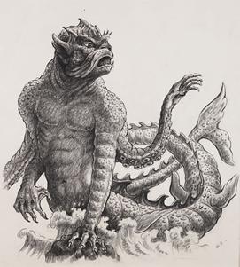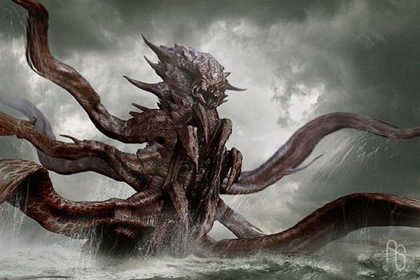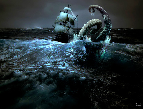 El autor de esa imagen del kraken no representa una versión del kraken parecida con la descripción, pero muestra la “gigantez” del monstruo, así como la versión cinematográfica vista en la célebre película "Duelo de Titanes". Monstruo marino del folclore noruego, “parecido a un calamar gigante”. Su tamaño tan solo es comparable al de ciertos dragones rojos y dorados, siendo en muchos casos mayor al de éstos. Puede medir unos 90 metros de alto por término medio. Cuando se acerca a la superficie y permanece quieto se puede confundir con una isla. Su aspecto se asemeja al de un pulpo gigante con numerosos tentáculos, y unos enormes ojos con los que controla cualquier movimiento de otras criaturas, tanto dentro como fuera de las aguas. Sus tentáculos tienen unas ventosas de unos 2 metros de diámetro. Tiene también dos tentáculos especiales, recubiertos de lengüetas afiladas, con los que generalmente ataca. Como cualquier cefalópodo, el kraken es capaz de expulsar tinta negra para escapar de sus enemigos, aunque cuesta pensar que un ser como éste necesite escapar, excepto de otro kraken furioso. Ni el mismísimo leviatán es comparable ni en fuerza ni en tamaño. La primera mención escrita sobre el kraken aparece en la historia de Noruega de Ludvig Holberg (1752), pero el monstruo era ya conocido por los pescadores noruegos del siglo XVI. Estos notificaron que durante un día caluroso, varias millas mar adentro, los sondeos que hacían sobre la profundidad subieron misteriosamente de 15-20 brazas a sólo 5, y que capturaron una cantidad anormalmente grande de peces. Según ellos, esto se debió a que un kraken estaba saliendo a la superficie, por lo que remaron hasta una distancia segura y vigilaron si aparecía. Tenía tres mil metros de largo, con brazos como mástiles, y era tan fuerte que podía echar a pique un barco de guerra. Cuando se sumergió, originó un remolino tan fuerte que arrastró varios barcos bajo el agua.