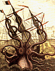 suma, podemos estar ante un ejemplar de "pulpo gigante". Los avistamientos de krakens se producen desde hace siglos, y han sido más frecuentes en las costas del Atlántico Norte y de Noruega. De hecho, un obispo noruego describió en 1752 al kraken, y afirmó que el negro de las aguas de Noruega se debía al mecanismo de defensa del inmenso animal. Los marineros de barcos de vela temían más que nada la aparición de este terrible ser, y vigilaban con nerviosismo las aguas profundas con la esperanza de no ver ningún burbujeo abundante, señal de que el kraken estaba ya demasiado cerca. Cuando el kraken aparece o emerge alguno de sus tentáculos ya no es necesario correr. Una vez ha divisado a sus víctimas se lanza al ataque, las golpea y las envuelve con sus tentáculos mientras las arrastra a sus terribles fauces. Hay rumores sobre islas tropicales que han quedado absolutamente vacías, tanto de animales como de humanos, tras el paso del malvado animal. Sus guaridas se encuentran a varios miles de metros bajo el mar, y son verdaderos complejos de cavernas en los que deposita los restos de cadáveres que no ha devorado, con el fin de conservarlos hasta que vuelva a despertar su apetito. Algunos informes aseguran que sólo han sido vistos dos craken, y que sus cuerpos no serían encontrados hasta el día del fin del mundo. Otros hablan de la celebración de una misa por el obispo de Nidros a lomos de un craken que permaneció inmóvil hasta que finalizó la celebración. También se han consignado avistamientos de estos monstruos varados en los arrecifes de Alstadhang (1680) y en Rothesay, en la isla de Bute (Escocia, 1775). Los científicos piensan que el craken legendario no era más que un calamar gigante y que la extraña variación de profundidad de los pescadores noruegos pudo deberse a que centenares de calamares pequeños crearon un fondo falso, confundiéndoles en su sondeo.