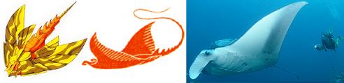 Erróneamente, representó al Kraken como una mantarraya al darle forma a la Scale. Aunque la mantarraya es inofensiva también aparece en las leyendas como un monstruo marino, al que los indígenas americanos llamaban "Gran diablo del mar". En la vida real algunas rayas alcanzan los 8 metros de longitud y las 2 toneladas de peso. Es incierta la razón por la que Kurumada hizo del Kraken Scale una mantarraya. En los mitos nórdicos el Kraken es un pulpo gigante monstruoso (en alemán una de las palabras para decir pulpo es simplemente kraken, aunque a veces le representa a la criatura como un calamar), así que seguramente lo hizo porque le era más fácil dibujar una mantarraya que un pulpo, era más fácil adaptar la forma de una mantarraya a una coraza que la de un pulpo / calamar. De hecho, Kurumada mencionó una vez que es el Scale que menos le gusta cómo le quedo, dijo también que hubiera querido darle un diseño más satisfactorio. Lo que invariablemente sorprende al ver el totem del Scale del Kraken diseñada por Kurumada es que tiene la forma de una mantarraya y no se parece en nada a los cefalópodos como en las leyendas nórdicas, sino a una mantarraya. Este diseño inusual puede proceder de un juguete transformer de esa época. De hecho, un robot de la gama Seacon salió en 1987 en Japón llamado Kraken y con la forma de una mantarraya, los Seacons pueden parecerse en la forma a un robot gigante llamado.... King Poseidón. La rareza de la asociación Kraken-Manta Raya sugiere que esto no es una mera coincidencia y que Kurumada se puede haber inspirado en este robot al dibujar la Scale del Kraken en 1988.