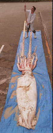 el calamar gigante alcanza entre los 18 y 20 metros de longitud y pesa