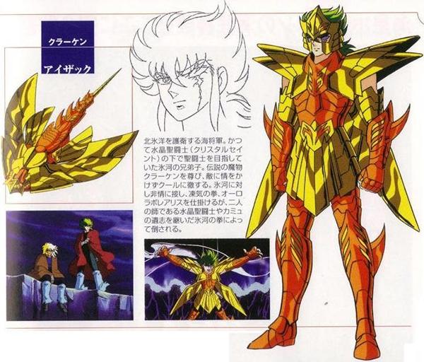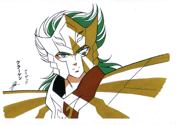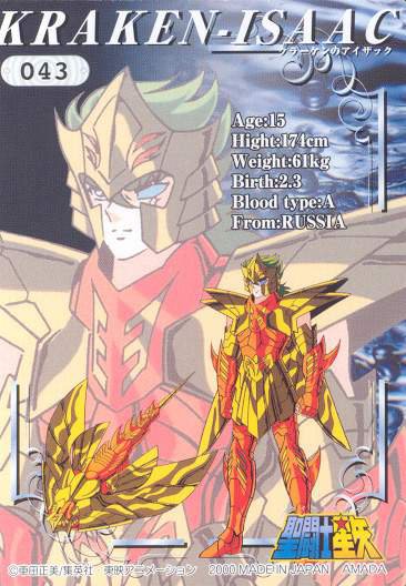 Como adulto Isaac era conocido por su rigor. A a la edad de 40 años, Isaac tomaría como mujer a su prima Rebecca, que era estéril. Dios les concedió sin embargo la posibilidad de tener gemelos, Esau, rojizo y melenudo, y Jacob. Isaac tenía entonces 60 años. Esau se volvió cazador mientras que Jacob era más bien casero. Isaac prefería a Esau y Rebecca prefería a Jacob. En su vejez Isaac se había vuelto ciego, pidió a Esau, a quien quería bendecir antes de morir, que le cazara una presa para comer. Rebecca oyó las palabras de su marido. Pidió a su hijo Jacob que se hiciera pasar por su hermano llevando sus prendas de vestir y una piel de animal que simulara los pelos de Esau. Jacob, equipado así, le llevó un plato de guisado sabroso a su padre quien lo bendijo. Cuando Esaú regresó de la caza se enteró de lo que había ocurrido y prometió que mataría a su hermano, por lo que su madre le dijo a Jacob que huyera a casa de su tío en Haran. Isaac se dio cuenta del engaño y no pudo bendecir a su segundo hijo. El nombre de Isaac hace referencia al de Jacob y contribuye a reforzar el ambiente católico entorno a Hyoga. En Saint Seiya, Kurumada probablemente eligió este nombre para la inflexibilidad de Isaac, pero también para mantener un tema del cristianismo en el entorno de Hyoga (el nombre de su madre, su rosario, sus rivales Babel, Isaac, junto a Moa y Christ en las películas). Otra razón para elegir este nombre es el hecho de que Isaac custodia el pilar del Océano Ártico, donde viven las ballenas beluga, las ballenas blancas, o el héroe de la novela Moby Dick de Herman Melville, se llama justamente Ishmael, otra ortografía de Ismael. Kraken. クラーケン (Kurāken) “Kraken / Craken” es un monstruo marino gigantesco, criatura mitológica (comúnmente de origen escandinavo, del folclore noruego), con forma de pulpo o calamar gigante, peligroso frecuentador de todos los mares de aguas profundas, especialmente de los del Norte, y que aparece a menudo en las crónicas de los navegantes antiguos. Los supervivientes contaban el relato del monstruo de los mares que, según la leyenda, aparecía junto a las costas de Noruega e Islandia. La tripulación de los barcos podía ahogarse o ser devorada por el Kraken. Lo que resulta sorprendente de las historias del Kraken es que de todos los mounstruos marinos, es tal vez el que tenga mayor posibilidad de ser real, pues se han encontrado ejemplares de hasta 20 metros. Las historias de Krakens tienen fundamento, tal como muchas otras historias de seres fantásticos, procedentes de la observación de la fauna, en el caso de los Kraken probablemente en ataques de calamares gigantes. El Kraken es uno de los más famosos mounstruos marinos de todos los tiempos. El Kraken también es visto en la mitología romana como una sepia gigante que controla las tempestades y las profundidades oceánicas, y que habita una caverna sumergida. El Kraken también aparece en la mitología griega. Poseidón ordenó a un Kraken que matase a la princesa Andrómeda, mas el Kraken se negó y Poseidón amenazó con matar a su familia. Después, el mismo Kraken fue muerto por Perseo.