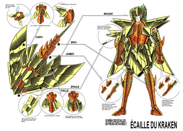 Fanart de Niiii'Link (Francia) PARTICULARIDADES DE LA ARMADURA : Kraken Scales: KaiMajin (Dios maligno del mar) Kraken Isaak, representa a una criatura mitológica inexistente en los mitos griegos pero que figura en muchas leyendas nórdicas del mar. Su representación más común es la de un pulpo o calamar gigante (de hecho, en alemán pulpo se dice Kraken) que atacaba navíos y poseía un dorso de dimensiones kilométricas. Kurumada se tomó licencia creativa al incluirlo, pues no era conocido por los griegos, es de la mitología nordica. Así que realmente, como se supone que las Scales fueron creadas en la era de los mitos de Grecia, antes que las Cloths, no habia posibilidad lógica de que una de ellas representara al Kraken, pues los griegos nunca tuvieron contacto con los pueblos nórdicos, los cuales probablemente aun en los tiempos más remotos de Grecia, cuando la historia real se puede ya distinguir del mito y la fantasia, todavia no existían como tales, y mucho menos su cultura. Colorización de Jaxom (Francia)