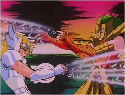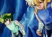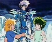 escena en la que Isaak revela a Hyoga al oído la identidad del hombre