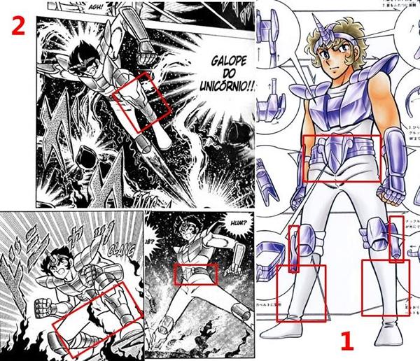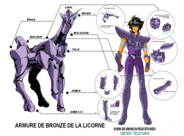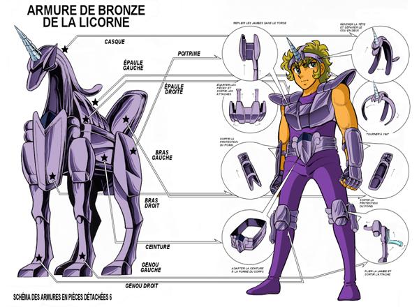 Su forma object (totem) imita claramente la figura de un Unicornio. Es de color morado, tono que le queda bastante bien. La armadura del manga tiene algunos puntos que difieren de la versión de la animación, la melena, el torso y la cola del Unicornio son un poco más desarrollados. En su totem, esta armadura tiene una mirada muy penetrante y a la vez agresiva, es sin duda una de las más bellas armaduras de bronce. Por contra, es de lamentar que, una vez ensamblada en el cuerpo del caballero, no sea tan hermosa como uno podría esperar (el casco es verdaderamente horrible), no hay que lamentar que esta armadura no haya evolucionado. La armadura del Unicornio en su forma ensamblada se reinventó completamente en su paso a anime. El cuerno se guardó intacto, pero en comparación con la versión manga, es mucho más largo en el anime. La simple diadema de la cabeza vista en el manga se transforma en casco integral, muy similar al de Pegaso V1, las hombreras tripartitas también se vuelven dos en el anime. Pero, lo que distingue claramente una versión de otra es la parte que cubre el torso, que es muy detallada, el busto del anime es mucho más plano y estilizado. El cierre del cinturón se transforma en una verdadera cáscara. La forma de las protecciones de los antebrazos se complica un tanto y las rodilleras se convierten en perneras.