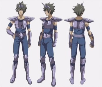 Colorización de Jaxom (Francia) La armadura varía mucho de manga a anime, donde se vuelve más estética y estilizada. El casco diadema del manga con un cuerno frontal pasa a ser un casco completo o integral en el anime e incluye todos los rasgos del mítico animal (ojos, hocico, orejas y cuerno). El cinturón adquiere un símbolo, el abrupto peto del manga pasa a ser liso con relieves. En el anime dispone de espinilleras y cuquillera. El color y el tono no varían.