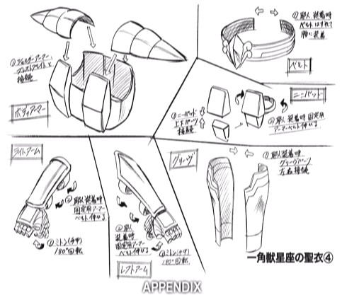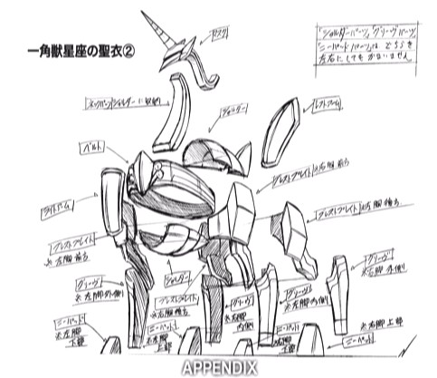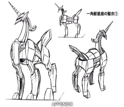 Unicorn no Cloth. ユニコーンのクロス “La Armadura del Unicornio”. Sin mito aparente, aunque se relaciona con las leyendas del Unicornio, encontradas en varias culturas y folklores, preexistentes a la constelación, no fue conocida por los griegos, representa a los legendarios caballos con un cuerno en la cabeza. Tiene relaciones más próximas con los celtas y los pueblos europeos. Representa una constelación moderna, agregada en el siglo XVII a la astronomía. La armadura del Unicornio es una armadura de bronce sin particularidades destacables. Cloth 聖衣 I