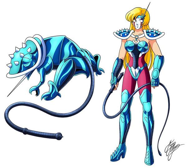 AURA : Kurumada nunca dibujó nada ni relacionó ningún simbolismo con este personaje en su manga. CONSTELACIÓN : Chameleon. カメレオン (Kamereon) “Camaleón” El Chameleon (en latín, Chamaeleon, pron. jp. kamereon za) es una de las 88 constelaciones oficiales y fue definida por los marineros alemanes Pieter Dirkszoon Keyser y Frederick de Houtman, y luego añadida por Petrus Plancius el siglo XVI en un atlas oficial. En el cielo es una pequeña constelación del hemisferio sur cuyas constelaciones lindantes son Musca, Carina, Volans, Mensa, Octans y Apus, muy próxima al polo celeste. La constelación fue una de las veinte constelaciones creadas por Pieter Dirkszoon Keyser y Frederick de Houtman entre los años de 1595 y 1597, y su primera aparición fue en el libro Uranometria de Johann Bayer de 1603. Sus estrellas más brillantes son de cuarta magnitud. La constelación contiene también una nebulosa planetaria débil llamada NGC 3195 AR: 10h 09m 30.0s Dec: -80°52'00" (Época 2000). Nebulosa planetaria entre δ Chamaeleontis y ζ Chamaeleontis. HERENCIA MITOLÓGICA : Nombre común de ciertos lagartos, conocidos por su capacidad de cambiar de color cuando se sienten amenazados y en respuesta a cambios de temperatura, luz, color y otras alteraciones ambientales. Este cambio es debido a la acción de hormonas que afectan a unas células pigmentarias especiales presentes en la piel. No obstante, los camaleones no siempre cambian de color para adaptarse al del medio que los rodea, como suele creerse. El camaleón tiene una lengua notablemente larga y pegajosa que proyecta hacia el exterior para cazar insectos. Su cuerpo tiene una forma poco habitual y la mayoría están especialmente adaptados a la vida arborícola. Sus patas largas y delgadas los separan del suelo, y sus dedos están divididos en dos grupos de dos y tres dedos que le permiten agarrar las ramas, en vez de aferrarse a ellas con las garras. También su cola, larga y curvada, es prensil. Muchos camaleones tienen la cabeza grande y abovedada y los machos pueden exhibir hasta tres cuernos, que en ocasiones utilizan en combate; una llamativa especie de tres cuernos es el camaleón africano de Jackson. El camaleón tiene un cuello corto y de movilidad limitada; no obstante, sus ojos son grandes y pueden moverse en muchas direcciones de forma independiente. Carece de tímpanos auditivos externos, o membrana timpánica. Su longitud oscila de unos pocos hasta 63 centímetros. En la península ibérica sólo vive el camaleón común, cuya distribución se extiende también al norte de África y algunas islas del Mediterráneo. Es una especie de color verdoso y hábitos arborícolas que puede cambiar de color según el estado en que se encuentra. En España es una especie en peligro de extinción, cuyas poblaciones, en el sur de la Península, están en franca regresión.