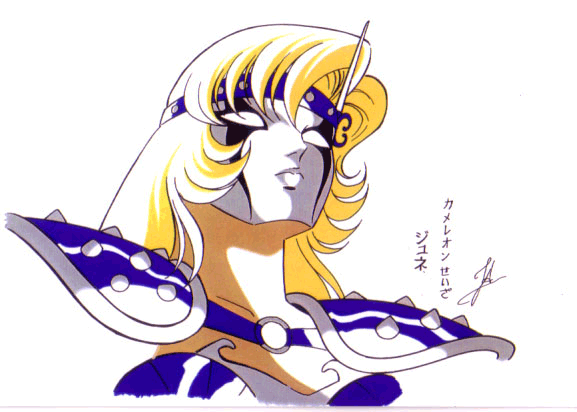 June de Camaleón (カメレオン星座のジュネ - kamereon no june) es una Bronze Saint que se entrenó en la Isla Andrómeda en compañía de Shun y bajo la tutela de Daidalos de Cefeo. Ella es bastante cercana y protectora de Shun, cuando se enteró de los planes de los Bronze Saints para ir a desafiar al Santuario, inmediatamente se dispuso para encontrar y detener a Shun, con la idea de impedirle que arriesgara su vida frente a los Gold Saints. Shun respeta sus sentimientos hacia él pero mantiene la intención de unirse a sus hermanos y se vió obligado a golpearla para dejarla inconsciente tras una breve pelea. El Saint de Andrómeda se la llevó a la mansión Kido para que descansara allí hasta su regreso. Tras una breve aparición durante la saga de los doce templos en un flashback, y hasta la fecha, June no ha vuelto a aparecer en el manga de Kurumada, ¿quizás rompieron?. ETIMOLOGÍA DEL NOMBRE : ジュネ Juné (pron. jp: kamereon no june): “June”, (Juno – Juné, nombre griego común). Ocasionalmente lo pronuncian como el mes de junio en inglés, pero realmente Ju-, suena como llu- de lluvia, y né está acentuado... Ju-né. (no hay variantes al nombre) Pero frecuentemente es mal pronunciado como el mes de junio en inglés, June. Cuando la forma correcta es Yu-né. El nombre June proviene de Junio, el mes consagrado a la diosa de la familia, Hera, aunque si fuera en inglés, en katakana se escribiria así: ジューン [juun] y Kurumada lo escribia ジュネ, o sea Juné.. Juno es la equivalente latina de la reina griega de los dioses, Hera. La tradición romana quería que los matrimonios tuvieran lugar en el mes de Junio, consagrado a la diosa de la familia.
