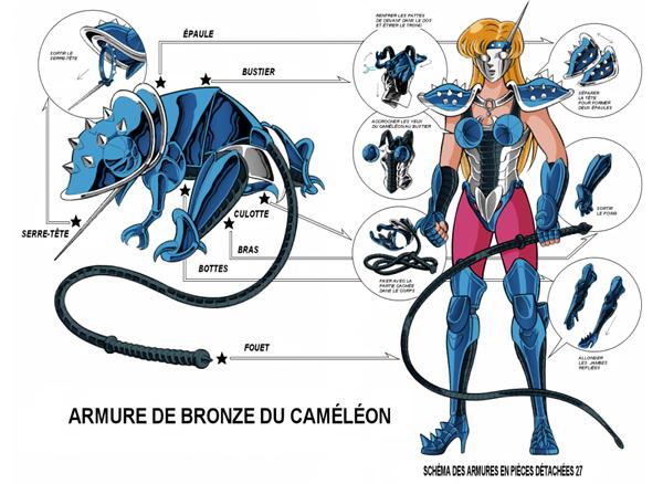 DE LA ARMADURA: Chameleon no Cloth. カメレオンのクロス (Kamereon no Kurosu) “La Armadura de Camaleón”. No hay mito asociado. El Camaleón es una de las constelaciones modernas del siglo XVII, introducidas por Johann Bayer en el año 1603 en su atlas astronómico: Uranometria. No posee mito propio, pero otras culturas como las africanas hacen muchas citaciones al camaleón en sus mitos.