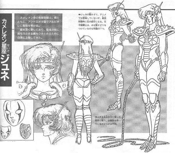 Comparativo del manga en serialización" y en el volumen o tomo Esta imagen pone de manifiesto que la entrada en escena de June abrió un debate entre la prepublicación y la publicación del manga clásico. Cómo podéis observar la versión inicial del bronze cloth de Chamaleon fue ampliada con más corazas y ropa que no dejaran tan al descubierto el cuerpo de June. Asimismo, el diseño del látigo también varía. En el número #16 de la Weekly Shônen Jump hace su primera aparición Chamaeleon June, quien, sorpresivamente, lo hace totalmente desnuda debajo de su Cloth; mientras que en la edición tankôbon #8 eso fue cambiado y se le agregó un par de pantalones para cubrir sus piernas. También se hicieron otros cambios, como el agregado de protectores a los costados del torso, el cambio de aspecto del látigo y la corrección del error del nombre de la constelación (en la pre-publicación sale como "Amaeleon" cuando debió decir "Chamaeleon"). Sorprendentemente, la Chameleon Cloth de la bella June tiene virtualmente el mismo diseño del manga en el anime. En el manga, la Chameleon Cloth tiene uno de los mejores y más elaborados diseños, y es notoria cierta influencia del anime en Kurumada. Felizmente, el excelente diseño de Kurumada pasó al anime sin modificaciones, aunque, existe sin embargo una importante diferencia entre la versión del manga y la del anime.