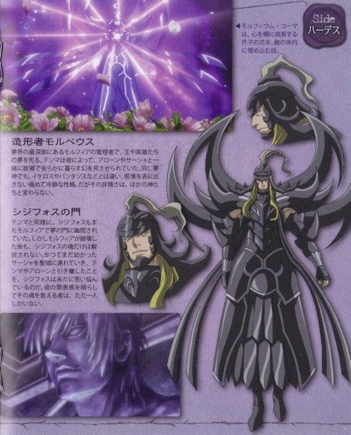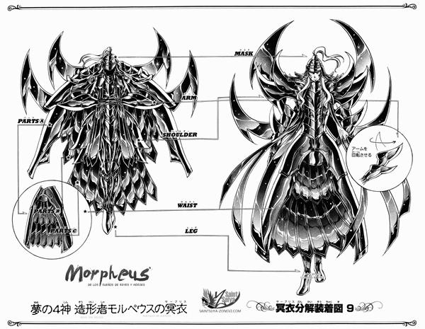 Morpheus el modelador, dios que reina sobre los sueños de los reyes y héroes (造形者・モルペウス pron. jp. Zōkeisha Morupeusu) es uno de los dioses de los sueños al servicio de Hypnos, es el cuarto de los hijos de Hypnos, el encargado de controlar los sueños de héroes y reyes. Él es quien mantuvo cautivo a Tenma en el mundo de los sueños, donde ya se encontraba Sísifo, con el alma herida por el golpe que le había infligido Hades, atrapando al Saint de Pegaso en una realidad de ensueño. Morpheus usa las amapolas del mundo de los sueños (夢 界 の 芥子 Mukai no keshi) para entrar en la conciencia, los sueños y las esperanzas del Saint de Pegaso, que se van quedando en el olvido a medida que las amapolas se vuelven incoloras. Después de la intervención de Atenea y la liberación de Tenma de las amapolas, luchó brevemente con él y lo encarceló de nuevo, sólo para ser eliminado cuando Tenma alcanza el Big Will durante una fracción de segundo, obteniendo de manera temporal su God Cloth en el proceso. ETIMOLOGÍA DEL NOMBRE : 造形者・モルペウス