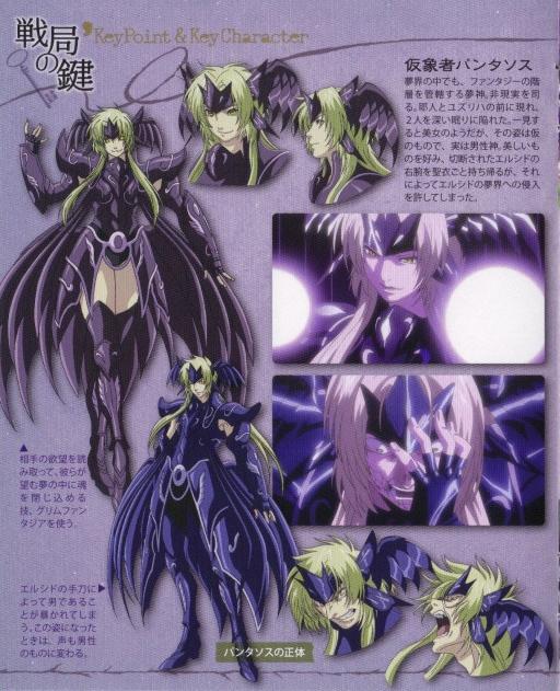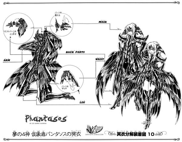 el nombre de Phantasos tiene un equivalente castellano: Phantaso. Desconocidas, contrariamente a sus hermanos no muestra nunca su destreza ni estilo combativos y parece ser el más débil de los cuatro. Phantasos no llegó a hacer mucho. Le vimos sólo encarcelar las almas de Yuzuriha y Yato en una pequeña esfera en el interior de la cual viven un sueño. HABILIDADES ESPECIALES : Relacionadas con el mundo de los sueños. Puede esconderse en un falso cuerpo femenino funcional. Al ser un dios, tiene una fuerza física fuera de lo común y puede viajar a su discreción entre el mundo real y el mundo de los sueños. Como todos los dioses, es inmortal, a menos que se destruya su cuerpo y su espíritu divino. En caso de necesidad, puede fusionar su propia alma con la de su hermano Oneiros, creando una especie de centauro volante muy poderoso. A pesar de no haber luchado, su poder se puede imaginar con su aparición en el manga: puede hacer caer a sus enemigos en el sueño profundo e insertarlos en hermosos sueños irreales. PERFIL PSICOLÓGICO : Phantasos nació en la época mitológica, junto a sus hermanos, le fue confiado el control del Mundo de los sueños, y en particular del Reino de las apariencias. El Dios que puede ejercer la irrealidad. Él es de naturaleza carnal, soñadora e infantil, creó una especia de piel femenina exterior, modificando también su armadura, normalmente aparece usando una falsa imagen de una versión femenina joven de él bajo la cual se esconde, y ejerce el poder de crear sueños irreales y ominosos. Al igual que sus hermanos Morfeo, Icelos y Oneiros, Phantasos es hijo de Hypnos y es por lo tanto dios del sueño, y más concretamente el dios de las “apariencias”. A primera vista, se podría tomar a Phantasos como una mujer ya que tiene la apariencia y los atributos. Este aspecto femenino no es realmente más que un “caparazón” bajo el cual se oculta el verdadero dios, seguramente para perturbar al adversario… Fue vencido por la irrupción sorpresiva de El Cid de Capricornio, que lo cortó por la mitad, y así se reveló su verdadera forma. PARTICULARIDADES DE LA ARMADURA : Su armadura se clasifica como Surplice, aunque no forma parte de las 108 ordinarias. Cubre la casi totalidad de su cuerpo, pero no dispone de poderes especiales o armas, su punto de congelación es desconocido.