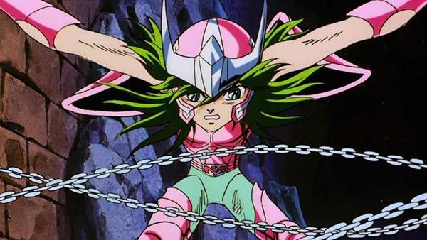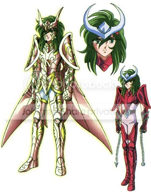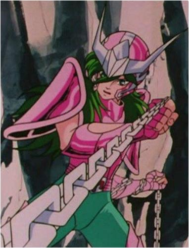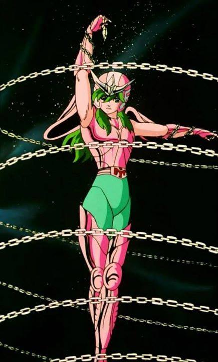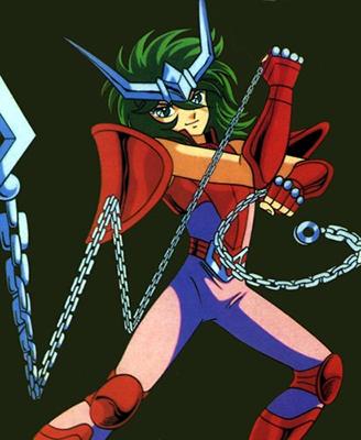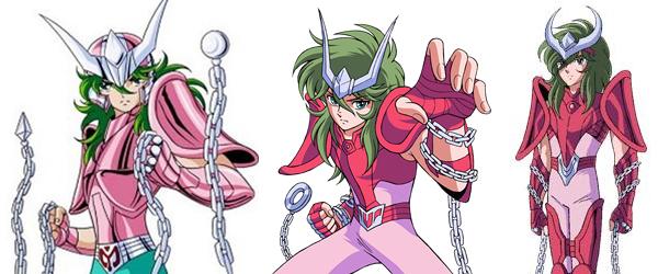 Cloth 聖衣 I - Bronze Cloth (manga) La primera versión V1 aparece por primera vez cuando Shun elige la esfera que le indica su rival en el torneo galáctico y la vemos por última vez cuando Mu la repara en la Casa de Aries. El casco diadema es simple, su pieza central está formada por un rombo y en los extremos surgen otras dos piezas alargadas y puntiagudas hacia arriba. Las hombreras son sencillas y abarcan más allá de la zona de los hombros. El pectoral cubre solamente la zona central del pecho y del abdomen, tiene forma de prisma. El cinturón es muy básico, con una hebilla pentagonal en el centro, e incluye 5 gemas. Las protecciones de los brazos son puntiagudas en el extremo final e incluyen las célebres cadenas de la armadura. Del protector del brazo izquierdo sale el extremo de cadena cuya punta es circular y que sirve para la defensa, y del protector del brazo derecho sale el extremo de la cadena cuya punta es triangular y sirve que para el ataque. Las rodilleras son redondas. No posee botas.