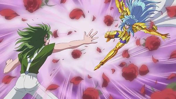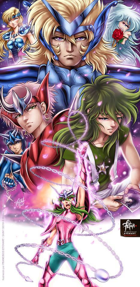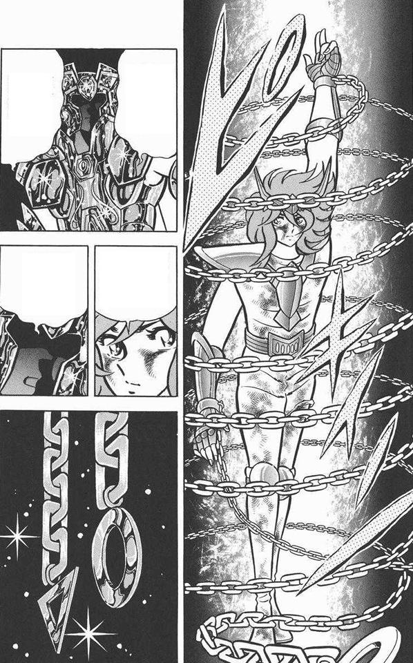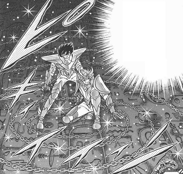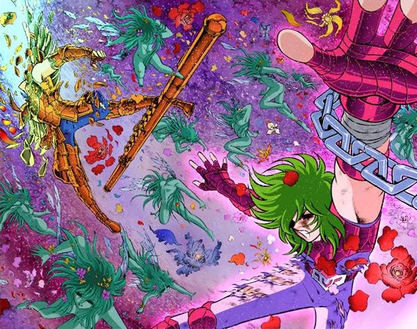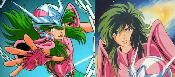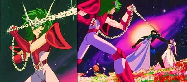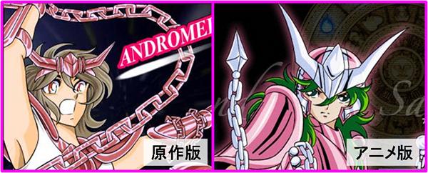 Fanart de Bena (Francia) Se puede notar que la batalla de Shun contra Aphrodite opone dos grandes figuras femeninas de la mitología griega nacidas del mar. El cliché (tópico o hecho común) de que Shun de Andrómeda siempre sea rescatado por su hermano Ikki de Fénix es casi sólo cosa del anime, teleserie y películas, en el manga pasa como dos veces y una en Next Dimension, En el #17 de la Weekly Shônen Jump del 07/04/1986, salido a la venta en Japón el 25/03/1986, es publicado el capítulo 15 (correspondiente a la tercera parte del capítulo 7 de la edición tankôbon) con el título "¡¿El corazón se ha detenido?!". En este capítulo se muestran las cadenas de Andrómeda con sus extremos finalizados en simples eslabones. Las puntas en forma de triangulo y círculo fueron agregados capítulos después. Llamativamente, este error no fue corregido en la edición tankôbon.