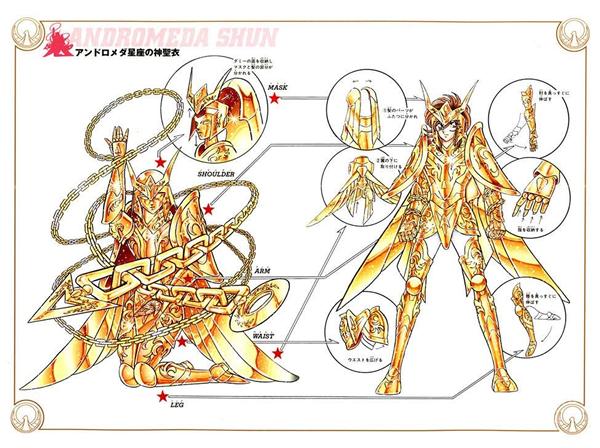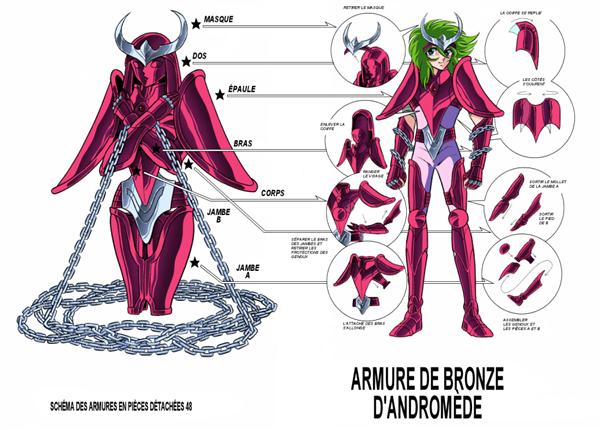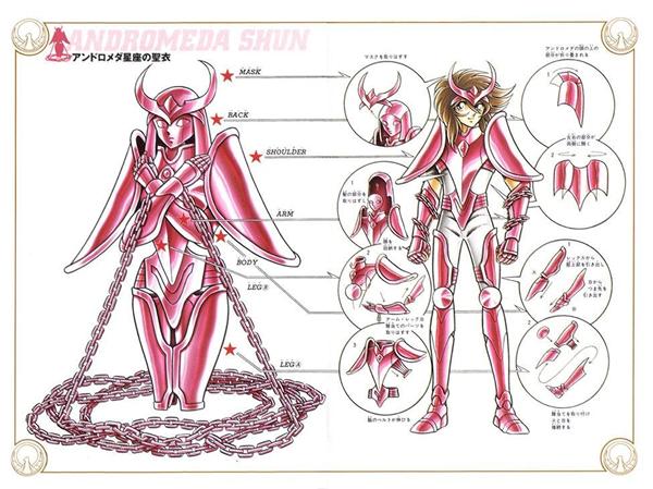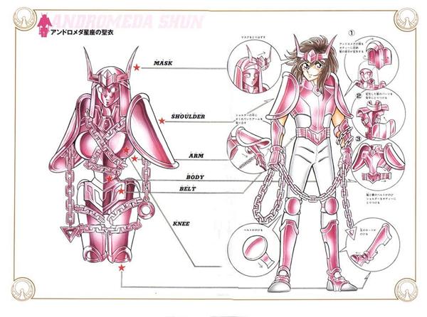 Fanart de Jesús del Pozo (España) Número de piezas: 10 Armas / piezas especiales: En los brazaletes están acopladas las dos cadenas de Andrómeda con extremidades diferentes, triangular para el ataque en el brazo derecho y circular para la defensa en el brazo izquierdo. Aunque las dos tengan una extremidad diferente por regla general la función de cada una es la misma sensiblemente. En cambio, cuanto más aumenta su cosmos Shun, más las dos cadenas se diferencian en sus actitudes. Las cadenas de Andrómeda están hechas de un material desconocido, más resistente que el normal de la armadura de bronce, y poseen muchos poderes y cualidades especiales que serán analizadas más adelante.