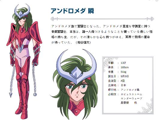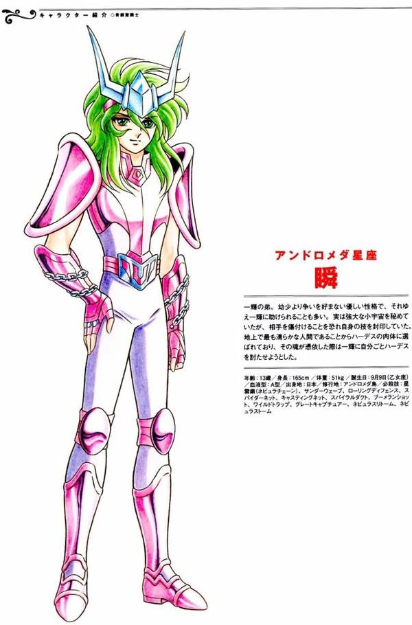 Código cromático del personaje (Bronze Cloth y Cosmos): Rosa Shun, caballero de Andrómeda (Andoromedaseiza no Shun) アンドロメダ星座の瞬 [pron. jp. andoromeda no shun] es uno de los cinco Bronze Saints héroes y protagonistas de Saint Seiya. Es uno de los pocos huérfanos recogidos por Mitsumasa en la Fundación que tiene un hermano mayor (Ikki de Fénix) a su lado, y sigue profundamente vinculado a él a lo largo de la serie, profesándole un gran amor y respeto. Shun es, junto con Seiya, el menor del grupo, aunque comparte el mismo padre que el resto de los principales Bronze Saints. Se entrenó en la isla de Andrómeda bajo la tutela del Silver Saint Cepheus Daidalos y regresó a Japón después de ganar su armadura con la esperanza de reunirse con Ikki. Fue presentado inicialmente como un chico muy popular entre el público femenino del torneo Galaxian Wars. Es un joven de piel clara y apariencia frágil, es evidente que sus rasgos están inspirados en su constelación guardiana, una constelación representada por una doncella. Su cloth de Andromeda es temida por el poder de sus cadenas, tanto ofensiva como defensivamente. Shun posee un carácter singular para un Saint: varias veces durante la serie declara que no quiere pelear o lastimar a sus oponentes, casi abandonando la lucha para no dañar a su enemigo; su espíritu gentil a menudo deja al adversario la posibilidad de elegir rendirse en lugar de ser derrotado, salvando así su vida: en la batalla contra Aphrodite, el asesino de su maestro, fue la única ocasión en la que mostró la voluntad de matar. Este comportamiento ha hecho que sus compañeros que no le consideren preparado para las constantes batallas y la fuerte presión psicológica de la lucha, pero, a pesar de todo, Shun ha continuado luchando por Atenea, cada vez con un comportamiento más determinado, pero sin ocultar su alma altruista. Shun ayuda a Atenea a recuperar el Santuario y más tarde se involucra en las batallas contra Poseidón y sus Generales. En el último arco, se revela que el collar que ha llevado desde que era un bebé le fue dado por Pandora, para marcar su cuerpo como el futuro cuerpo carnal para el alma del dios Hades. Ikki logra liberarlo después de que el dios se apodere de su cuerpo y ambos siguen a Atenea hasta Elysion, donde Shun brevemente endosa el Gold Cloth Virgo y ayuda finalmente derrotar a Hades. En el manga Next Dimension (secuela y precuela canónica), Shun acompaña a Atenea al siglo XVIII para salvar a Seiya de la maldición de la espada de Hades. Allí, se une con el anterior Bronze Saint de Pegaso, Tenma, para salvar a la desamparada diosa de los Specters de Hades. Se insinúa que Shurn será el futuro Gold Saint de Virgo, sucesor de Shaka. En la adaptación al anime, el nombre de su maestro fue cambiado a Albiore. Shun es el más generoso, sensible y frágil del grupo, es realmente un pacifista, no queriendo luchar ni matar a sus oponentes, odia la violencia y siempre trata de resolver los conflictos sin pelear, sólo demostrará el poder real de su Cosmos en contadas ocasiones, siendo capaz de sacrificarse para salvar a otro, no duda en atacar a sus enemigos si la vida de sus amigos está en peligro, lo que demuestra que es un Saint muy capaz. A pesar de su naturaleza inocente, frágil y sentimental, pues aparenta ser el más débil, Shun quizás tenga el poder más destructivo de los cinco protagonistas, aunque siendo el más moderado y reacio a usarlo. Después de cuatro temporadas y al menos tres películas, Shun se niega a renunciar a la idea de que los problemas pueden solucionarse de forma no violenta, hablando con sus enemigos con la esperanza de razonar con ellos. Él tiene la desafortunada tendencia a combinar esto con un carácter noble mártir y sin causa, casi regalando su vida en algunas pocas ocasiones, pero a la hora de la verdad y una vez que el enemigo le demuestra que es un monstruo, va a luchar y matarlos si es necesario. Cuando ve que su entorno o sus amigos están en peligro es capaz de exteriorizar ese gran poder. Algunos fans maliciosos caricaturizaban su sensibilidad y le tachaban de gestos afeminados. Lo que lo desmarca del grupo de héroes es su pacifismo, su disposición gentil y carácter bondadoso, Shun es una opción bastante extraña para un Saint, ya que cuando era niño era muy delicado y odiaba la violencia, posee un corazón afectuoso, y destaca por no usar todo su potencial en batalla ya que detesta lastimar a los demás. Shun busca a menudo parlamentar con su adversario y evita usar todas sus capacidades, hasta que no se ve forzado a hacerlo. Sólo reveló su poder oculto a lo largo de los sucesivos combates que encadena y por las delicadas situaciones en las que se ve involucrado. Shun, es uno de los personajes más fuertes de la serie, aunque su disposición gentil y naturaleza tierna tienden a retenerlo en el uso de su plena potencia, hasta que se ve obligado a hacerlo. El Bronze Saint de Andrómeda es quizás el más reacio del grupo al uso de la violencia, como Saint de la constelación de Andrómeda. Es un alma misericordiosa por naturaleza y un firme creyente en la solución de problemas sin causar derramamiento de sangre. Esto crea un fuerte contraste entre él y el resto de los héroes: mientras estos no dudarán en iniciar una batalla cuando la situación lo exige, Shun sólo se permite luchar si ello es una necesidad absoluta, o cuando su paciencia casi infinita se acaba. Llegado el caso, Shun puede convertirse en un luchador muy hábil y mortal. Acogida y recepción En Japón, Shun de Andrómeda es el tercer personaje más popular de Saint Seiya después de Shiryu y Hyoga, ocupó el tercer lugar en una encuesta relacionada con los cinco protagonistas de la serie. Mientras que en el sondeo de Toei Animation sobre el personaje favorito de la serie de anime Saint Seiya Ω ocupó el octavo lugar entre 68 personajes.