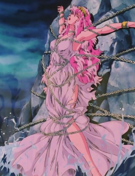 アンドロメダのクロス (Andoromeda no Kurosu) “La Armadura de Andrómeda”. El personaje mitológico representado es la hija del rey Cefeo, que fue entregada como sacrificio a Poseidón. Iba a ser devorada por el monstruo Cetus, pero fue salvada por Perseo.