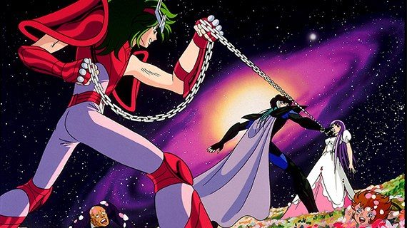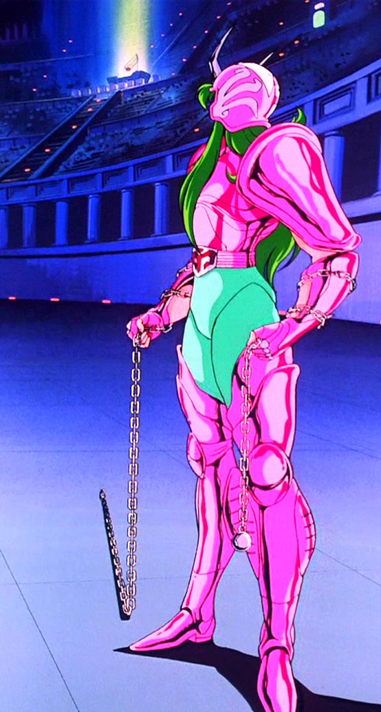 La palabra griega nunca está sola, siempre viene asociada a otra palabra. En el caso de la serie sería “La Honorable Armadura”, en referencia al Cloth de Sagitario en donde estaba oculto Ikki. Lo curioso de esto es que la palabra está escrita en griego pero con letras latinas, algo bizarro sin dudas, pero a su vez algo común en el universo de Saint Seiya. Cabe aclarar que la palabra está escrita en griego y no en alfabetización latina, repetimos, está en griego con letras latinas. Esto se aclara ya que uno podría pensar que la palabra está escrita en griego con las letras Alfa mayúscula que es igual a la letra A latina. Seguida de la letra Chi griega mayúscula que es igual a la equis latina. Después vendría la Iota que es igual que la I latina, y por último se repetiría la alfa. ¿Por qué la armadura de Andrómeda es de color rosa? El color rosa de la armadura de Andrómeda más que un signo de feminidad, es una evocación al color de la nebulosa del mismo nombre. La Nebulosa de Andrómeda se ve de color rosa / rojo en las fotografías tomadas por los telescopios, lo que motivó a Kurumada y los diseñadores del anime a orientarse hacia estos colores para la Cloth de Andrómeda.