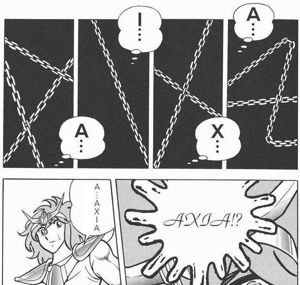 ¿Qué escribió la Cadena de Andrómeda durante el torneo galáctico y qué significa? AXIA (alfabeto latino) / アクシア (Kana) / Άξι-α (griego) (Akushia (romaji) / Áxia), la misteriosa palabra que en griego significa "algo importante, valioso", “honorable”, “admirable”, “que vale lo que dios”, “digno”, indicada como advertencia a Shun por el instinto defensivo de la cadena de Andrómeda durante el torneo Galaxian Wars, concretamente en el combate de Shun contra Jabu. Resulta que hermano Ikki, Bronze Saint del Fénix, había irrumpido en el certamen para vengarse de la Fundación Graad y robar la armadura de oro, las cadenas detectaron su presencia, así como su instinto asesino, y quisieron advertir a Shun que su enemigo se encontraba escondido en la urna dorada de Sagitario.
