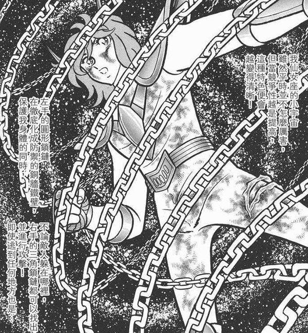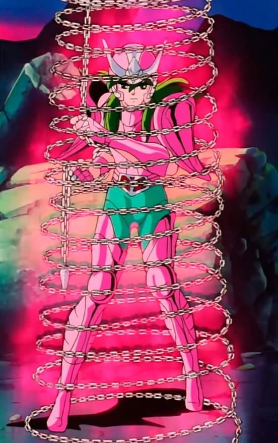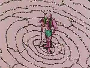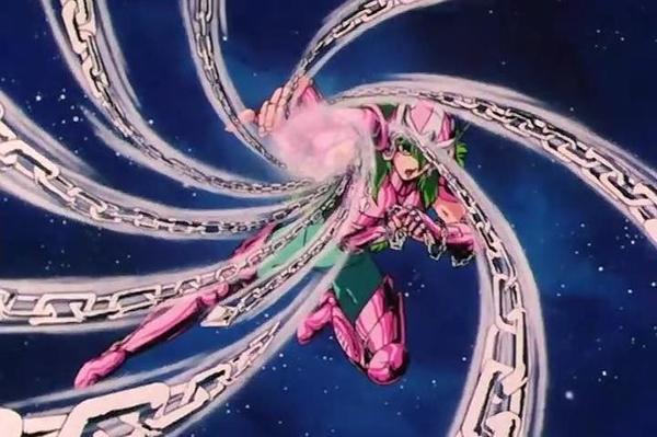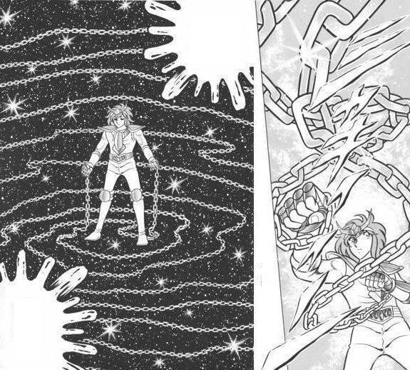 de accesorio de Cloth según el Cosmo Special La Cadena de Andrómeda se despliega en círculos concéntricos en el aire alrededor del cuerpo del Saint creando una cúpula que lo protege de los golpes enemigos; el movimiento giratorio también permite que la cadena contrarreste las ofensivas contrarias siempre que sea posible.