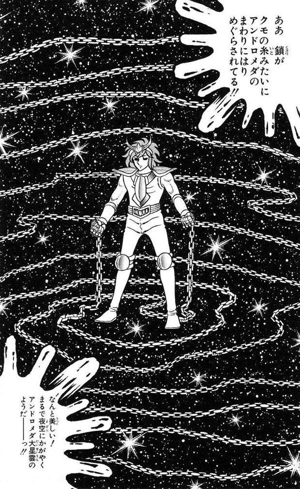 Attack (Cadena Cuadrada para Ataque) Andromeda Cloth no Bōgyo Honnō. アンドロメダ聖衣の防御本能 - (アンドロメダクロスのぼぎょうほんの) “El Instinto Defensivo de la Armadura de Andrómeda”. La misteriosa cadena nebular de Andrómeda es legendaria por su durabilidad y por su gran longitud, ya que sus dos extremos se pueden extender y alargar hasta el infinito, lo suficiente como para llegar a años luz de distancia (es difícil explicar cómo caben tantos metros de cadena en esa armadura, es un efecto puramente estilístico), tampoco es una simple arma hecha de piezas metálicas ensamblada en los brazos de las corazas, posee una cierta forma de conciencia, la cadena nebular está regida por un enigmático espíritu que la anima y la puede hacer crecer o multiplicarse, tiene la propiedad de aprender de la experiencia y adaptarse a cada situación según convenga, las dos cadenas juntas asumen espontáneamente la formación de la nebulosa Zowah de Andrómeda que les da su nombre, lo mismo sirven para escalar precipicios que para atravesar dimensiones espacio-temporales, en una situación grave el Saint puede dar un aviso a sus compañeros valiéndose de esa capacidad de la cadena de atravesar dimensiones, incluso vimos que la cadena sirve de nexo de unión y transmisión de datos, para comunicarse.