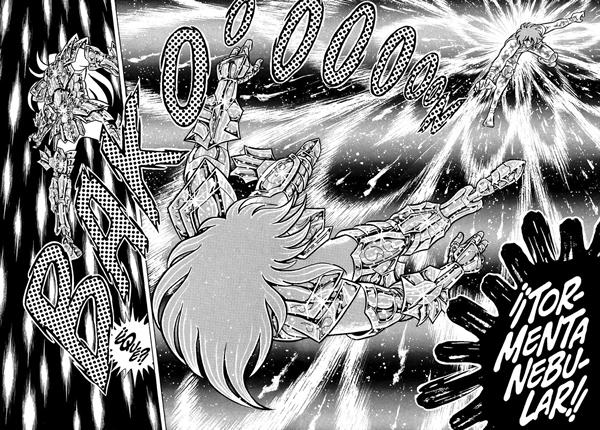 de soplo según el Cosmo Special Encontrándose en dificultades, cuando sus cadenas no sirven por haber sido destruidas, Shun se quita su armadura y revela estas dos técnicas finales en el templo de Piscis frente a Aphrodite, pero parece que las conocía mucho tiempo antes, son dos movimientos evolutivos que es capaz de utilizar sólo con su Cosmos, a diferencia de sus otras técnicas, basadas en las cadenas de su Cloth. En cierto modo, su carácter "cobarde y derrotista" es un aspecto fundamental en el complejo de la psicología de este personaje, perpetuamente dividido entre el deseo de paz y la voluntad de cumplir con sus deberes de Saint. La fuerza que distingue el cosmos de Shun es muy amplia, como el propio Bronze Saint demuestra a su maestro después de superar el ritual de Andrómeda para obtener la armadura, y la tendencia a huir de la batalla son un freno a esa poderosa fuerza destructiva. La Nebulosa de Andrómeda (Nebula Storm en el manga), que representa el último nivel de este cosmos, es la manifestación del poder total que proviene de esta constelación. Una vez liberado el poder de la Nebulosa de Andrómeda, detenerlo es cada vez más difícil, hasta incluso el propio Bronze Saint de Andromeda ya no puede hacerlo: una vez liberada la Nebulosa esta comienza a autoalimentarse en primer lugar con el cosmos del Saint que la usa y después se convierte en una fuerza autónoma que aumenta en intensidad hasta aniquilar al enemigo y todo lo que se le interpone. Bakuhotsu Nebula. 爆發吧星雲 “Explota Nebulosa”. En su combate contra Aphrodite Shun grita esta frase como pasaje directo del Nebula Stream al Nebula Storm, quizás sea el desencadenante de dicha técnica. La Nebulosa de Andrómeda está dividida en 2 etapas distintas: Primera etapa - Nebula Stream (Corriente de la Nebulosa) La Nebulosa de Andrómeda toma la forma de una corriente de aire ligera, difusa y coloreada; las radiaciones energéticas que forman las corrientes expandidas por el campo de batalla tienen el color del cosmos del Bronze Saint de Andrómeda. El objetivo de las olas es inmovilizar al enemigo, impidiéndole incluso los movimientos más pequeños. El Nebula Stream toma forma y se fortalece de acuerdo con los movimientos y resistencia del oponente, hasta que la corriente se convierta en una verdadera tormenta. Teniendo acceso completo a su Cosmos, Shun invoca una corriente de aire conocida como Nebula Stream, ネビュラ ストリーム (Nebyura Sutoriimu), un vapor nebuloso rosáceo que maneja a voluntad e invade todo el campo de batalla. El aire en movimiento toma la forma de torbellinos, semejantes a nebulosas, que rodean, envuelven y bloquean al adversario, inhibiendo su movilidad al ejercer una fuerte presión sobre él, a quien Shun da la opción de rendirse, advirtiéndolo que si intenta moverse el torbellino puede cambiar agresivamente y cuanto más se esfuerce el aire girará de manera mucho más violenta y mayor será la presión, aumentará progresivamente de magnitud en la medida que el enemigo la contrarresta hasta transformarse en una tormenta. Por sus características la Nebula Stream es similar en naturaleza al ataque Kol'tso de Hyoga. Naturaleza: técnica de Cosmo. Segunda etapa - Nebula Storm (Tormenta / Tempestad de Nebulosa) La Nebulosa de Andrómeda toma la forma de una tormenta que aumenta gradualmente en intensidad sin detenerse; este es el momento crítico en el que el Bronze Saint de Andrómeda normalmente advierte a su oponente que pronto perderá el control de su poder. Con el fin de controlar la corriente cada vez más fuerte el Saint la dirige con los movimientos del cuerpo, manipula la intensidad del flujo de corriente energética a fin de bloquear al oponente y privarle de toda capacidad ofensiva; esto no evita que la Nebulosa aumente en intensidad. Cuanta más fuerza y resistencia oponga el oponente, más agresiva se volverá la tormenta de la Nebulosa, derribando al enemigo con un ímpetu cada vez mayor y violento hasta que lo prive de vida.