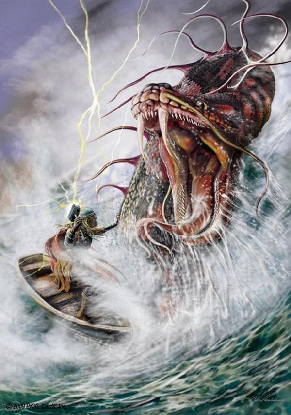 Thor acaba por pescar a Jörmungandr y la devuelve al océano tras golpearla