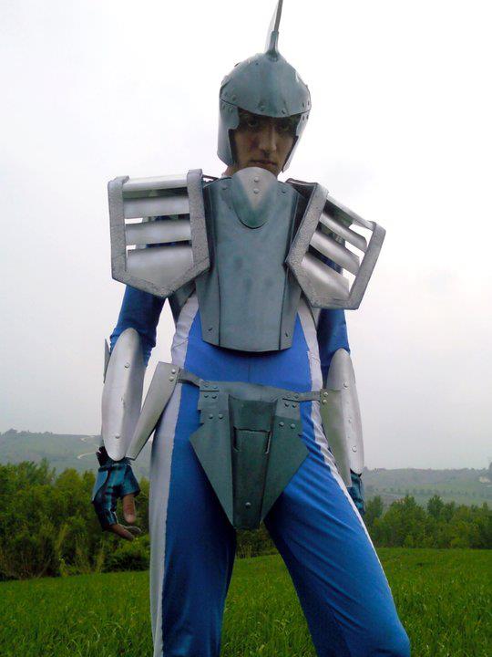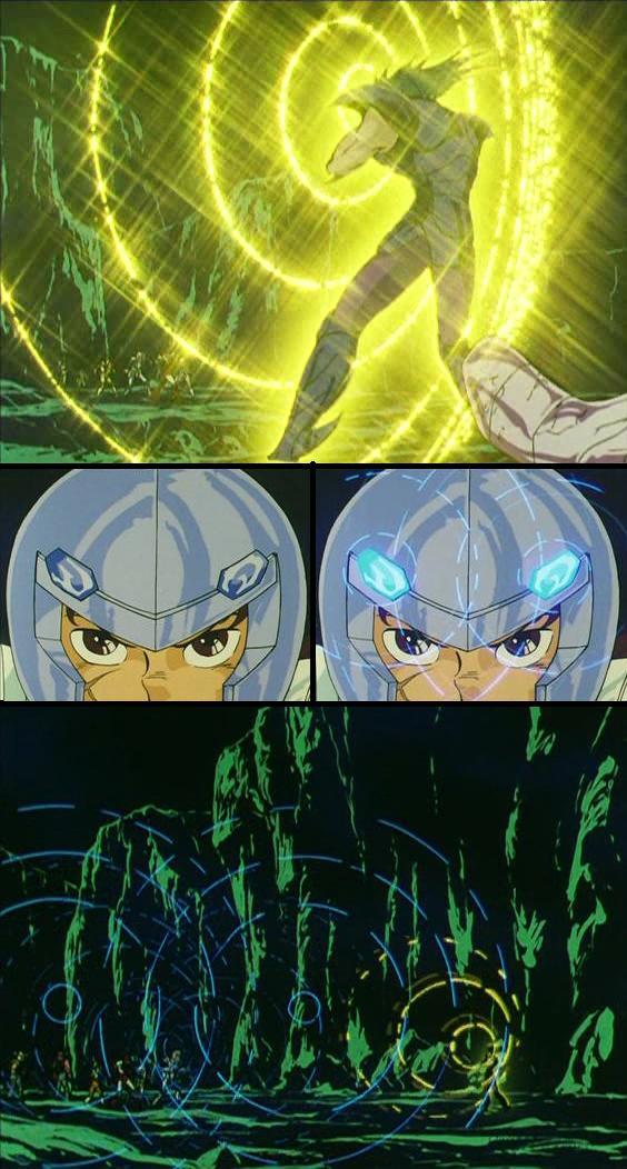 ACCESORIOS : La armadura incorpora dos dispositivos situados en los ojos de los laterales de su casco en forma de pez que tienen la capacidad de proyectar ondas electrónicas capaces de bloquear ataques mentales como el de Spartan, asimismo, por medio de turbinas integradas en sus antebrazos, puede lanzar potentes chorros de agua.