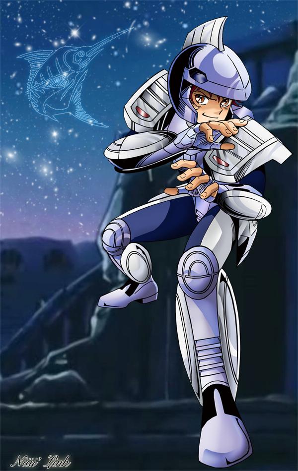 Su armadura está basada en la constelación del Pez Espada, es completamente mecánica y cibernética, tiene la cualidad de emitir ondas mentales para bloquear ataques del mismo tipo. Fue creada por el Profesor Asamori bajo las directivas de Mitsumasa Kido y no está viva como las armaduras convencionales de Atenea. Sin embargo, cuando no es vestida por su usuario, es plenamente autónoma y capaz de volar, también puede servir como medio de locomoción para su poseedor.