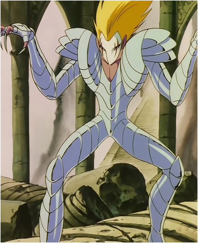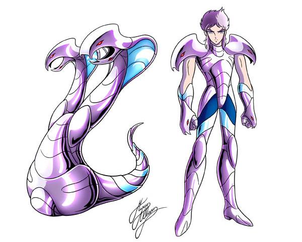 Fanart de Marco Albiero (Italia) La armadura de Astaroth es de color blanco. Las protecciones de las piernas cubren completamente la extremidad, del pie llegan hasta la parte alta de muslo. El peto y el cinturón están unidos. Los guanteletes cubren el brazo hasta el codo, los puños tienen terminaciones en forma de cabezas de animal, con colmillos afilados, parecidos a serpientes. Las hombreras son grandes con terminaciones similares a las de los puños. La armadura no tiene casco, o bien Astaroth no lo usa. ACCESORIOS : Ninguno. AURA : Cuando Astaroth concentra su Cosmos, aparece una cobra bicefala tras él. La anfisbena (del griego, "que va para ambos lados") es una serpiente mitológica de colmillos venenosos con una cabeza en cada extremo del cuerpo que come hormigas. Según la mitología griega, las anfisbenas fueron creadas de la sangre que goteaba de la cabeza de Medusa cuando Perseo volaba sobre el desierto de Libia (África). La criatura probablemente deriva de los lagartos vermiformes del mismo nombre, cuyas extremidades del cuerpo muy semejantes hacen que sea muy difícil determinar dónde está la cabeza y donde el ano. Se encuentran en los países mediterráneos, donde muchas de estas leyendas se originaron.