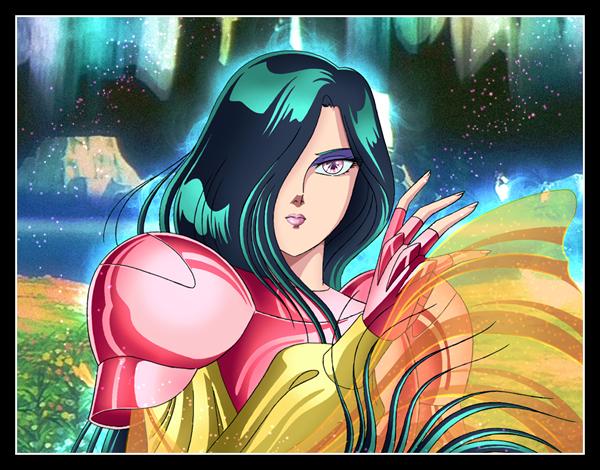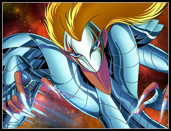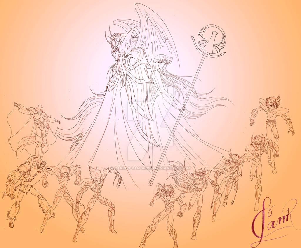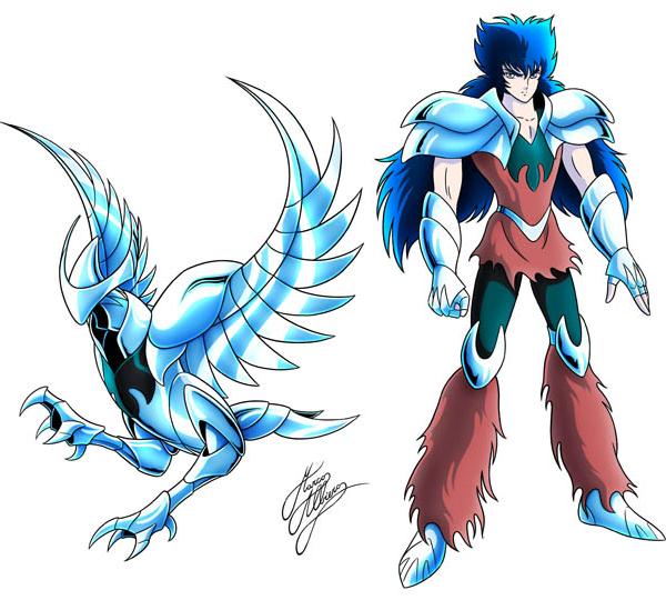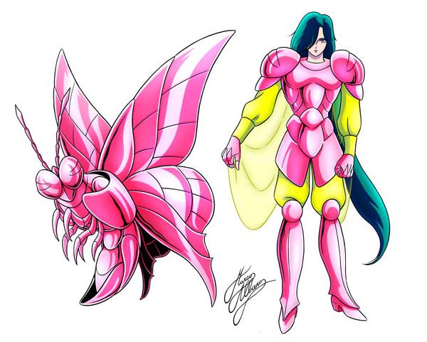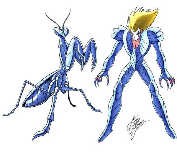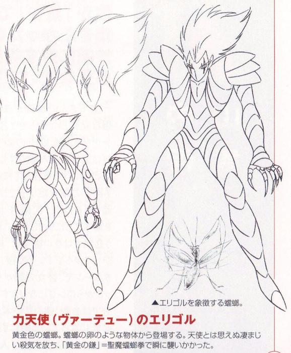 Fanart de Juni Anker (Nicaragua) HERENCIA MITOLÓGICA : En demonología el demonio Eligor (o Abigore) es uno de los grandes duques de los infiernos, representado como un espectro montado en un caballo alado, y lidera 60 legiones de demonios. Se le representa como un caballero glorioso portando una lanza, un estandarte y un cetro. Entre sus atributos se encuentran su capacidad para descubrir lo oculto y conocer tanto el futuro como los secretos de la guerra. Es capaz de predecir el resultado de los enfrentamientos y el destino de los guerreros en el campo de batalla, y también puede asegurar o corromper su lealtad, lo que hace de él un demonio frecuentado por los reyes y caballeros. A veces también se lo representa como una figura espectral montado en un caballo sin carne (a veces con alas), que le fue ofrecido por el Gran Duque Belcebú que lo hizo de los restos de un caballo del jardín del Edén. En la jerarquía angelical, Las Virtudes están por debajo de Los Tronos y son los responsables de controlar los movimientos de los cuerpos celestes para garantizar la armonía en el cosmos. También son consideradas orientadoras de las personas conforme a la Voluntad Divina. Virtue es el nombre inglés de la Virtudes. Sobre la base de la Jerarquía celeste del Pseudo-Dionisio Areopagita, las Virtudes son el quinto coro de ángeles y forman con los Poderes y las Dominaciones la orden de Gobernadores. Las Virtudes están representadas en general, ya sea llevando un libro, los instrumentos de la Pasión, es decir, una cruz, una corona de espinas y una lanza. Su líder es el ángel Michael. Entre los ángeles caídos se cuentan entre las Virtudes a Belial y Meririm. El personaje de Saint Seiya se llama la mantis religiosa de oro (pron. jp. go0rudo n Kamakiri) y utiliza un estilo de lucha similar a muchos estilos de la "mantis religiosa" de Kung Fu. Las mantis religiosas son insectos depredadores que se alimentan principalmente de otros insectos vivos, pero las especies más grandes pueden incluso matar a aves pequeñas, lagartijas y roedores. Ellas son bien conocidas por sus famosas piernas cortadoras y su extraña conducta nupcial, a veces la hembra devora la cabeza del macho al final de apareamiento. CORO : Las virtudes son representadas por el reino mineral y por las leyes que rigen la creación y son consideradas orientadoras de las personas, de acuerdo con la Voluntad Divina. Reflejan el deseo de Dios y ofrecen al hombre discernimiento. Ellos tienen el poder para calmar la furia de la naturaleza, como tormentas, maremotos y terremotos. Trabajan con milagros. El príncipe de esta categoría se llama Rafael, que es el auxiliador de los trabajos de cura. Su nombre significa "la medicina de Dios". Pueden ser representados llevando en la mano un palo o un bastón. Las atribuciones de los Santos Ángeles de este coro son similares aquellas de los Santos Ángeles del coro de las Potestades, porque también ellos transmiten aquello que deben hacer los otros ángeles, pero, sobre todo, auxilian en el sentido de que las cosas sean realizadas perfectamente. Por lo tanto, también tienen la misión de remover los obstáculos que pudieran interferir en el perfecto cumplimiento de las órdenes del Creador. Son considerados ángeles fuertes y viriles. Quien sufre de debilidad física o espiritual debe invocar, por medio de oraciones, la ayuda y la protección de un Santo Ángel del coro de las Virtudes. CURIOSIDADES : El nombre japonés de la casta a la que pertenecen los secuaces de Lucifer es Seimatenshi, que literalmente significa “Angel Sagrado Maléfico”. Por razones prácticas, se optó por Angel Demoníaco, lo que no traiciona el significado original del término (la palabra Angel abarca una idea de lo sagrado).