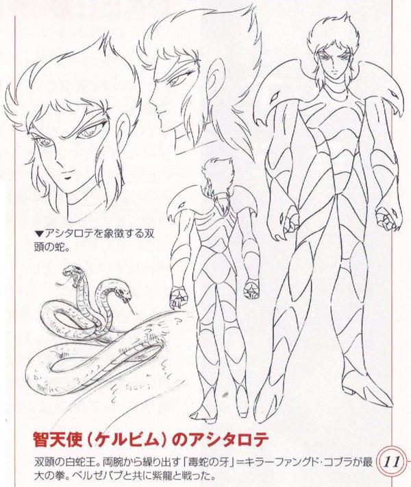 Fanart de Juni Anker (Nicaragua) HERENCIA MITOLÓGICA : Astaroth es conocido como el “gran duque del Infierno“, de la primera jerarquía demoníaca -a la que también pertenecen Belcebú y Lucifer– que seducía por medio de la pereza y la vanidad. Solía tomar la forma de un ángel montado sobre un Dragón Infernal con una víbora en su mano izquierda. Comandaba 40 legiones, conocía tanto el pasado como el futuro y podía dar respuesta a cualquier pregunta por muy enigmática que fuera. De ahí que se le conociera como el Ángel del Conocimiento, dada su condición de Querubín. Querubín o Kerubim, es el plural de Kerub, nombre hebreo que significa “efusión de sabiduría”. Son los ángeles que reciben la sabiduría de Dios y los responsables tanto de ordenar el caos universal como de ofrecer a los seres humanos el conocimiento. Astaroth de Querubín también responde al apodo de rey serpiente blanco bicéfalo, que se manifiesta en su ataque “Los Comillos Asesinos de la Cobra”. Puede referirse a la Anfisbena, serpiente mitológica con una cabeza a cada extremo del cuerpo, creada de la sangre que goteaba de la cabeza de Medusa, o a los Nagas, semidioses de la mitología hindú con forma de serpiente. De hecho, el rey de los Naga es representado como una cobra con un número impar de cabezas. En demonología Astaroth es un poderoso Gran Duque del infierno. El Diccionario Infernal lo describe como una especie de ángel viejo y monstruoso con una corona y que sostiene una serpiente en una mano mientras cabalga un dragón. Según Sebastian Michaelis es un demonio del primer círculo, y tienta a los hombres mediante la exasperación de su vanidad o ofreciéndoles lujúria. El demonólogos del siglo XVI, lo convirtieron en el maestro de los inquisidores y afirman que sus poderes contra los seres humanos están en su punto álgido en agosto. A veces también es mencionado en una trinidad demoníaca compuesta por Lucifer, Beelzebub y Astaroth, por lo que en Saint Seiya Beelzebub es, precisamente, el ángel caído que parece más cercano a Lucifer, y Astaroth acompaña a Beelzebub lo que une aun más a estos tres personajes que Eligor o Moa. Kerubim es el plural de Kerub, que es el nombre hebreo de los querubines y significa "efusión de sabiduría." Se hace mención de estos ángeles en el Antiguo Testamento desde el Génesis, cuando, armados con espadas de fuego vigilan las puertas del Jardín del Edén una vez que Adán y Eva fueron expulsados. Luego hay muchos textos que describen a Dios sentado sobre los querubines. En el siglo VI, en la Jerarquía Celestial del Pseudo-Dionisio Areopagita, constituyen el segundo coro de ángeles y forman con los serafines y los tronos la orden de los consejeros. Ellos normalmente son representados con dos pares de alas y rodeados de ojos o plumas del pavo real simbolizando su inteligencia. Su líder es el ángel Ratziel. También existen querubines entre los ángeles caídos, como Satanás o incluso Satanaël. Los querubines son entidades sobrenaturales presentes en el Antiguo y Nuevo Testamento. Estos ángeles son generalmente asignados a funciones de guardia, están, por ejemplo, los querubines que custodian el árbol de la vida en el paraíso después de que Adán y Eva fueron expulsados. El libro de Ezequiel (Ezequiel 1:5-28) ofrece una descripción detallada de los querubines haciendo de ellos a criaturas humanoides cuyos pies son patas de ternera y están equipados con 4 alas, 2 salen de la cabeza y que 2 cubren sus cuerpos. Sus cabezas tienen 4 rostros, un hombre en la parte frontal de la cabeza, un león de la izquierda, un buey a la derecha, un águila en la espalda, y la apariencia general de su cuerpo es similar a la un carbón ardiente. Esta descripción no es retomada por los artistas del Renacimiento, que los ilustran como niños pequeños equipados con un par de alas. Son ángeles del segundo coro de la primera jerarquía, lo que los coloca por encima de los tronos, pero por debajo de los serafines. Al personaje de Astaroth se le asigna uno de los cuatro rangos angelicales más elevados a diferencia de sus compañeros, incluso si no parece haber ninguna vinculación especial entre él y esta función. La protección metálica usada por Astaroth y su ataque evocan a las serpientes, atributo del Gran Duque de la demonología. También se puede observar que se enfrenta a Shiryu de Dragon, un animal que cabalga Astaroth. También es interesante ver que Astaroth lucha en compañía de Beelzebub, representado por el Garuda, pues en el hinduismo el Garuda y los nagas, que son serpientes, son enemigos tradicionales (ver más detalles acerca de esta leyenda en la ficha de Aiacos de Garuda). Otra posible fuente que podría explicar el vínculo entre Shiryu y Astaroth podría ser la leyenda china de la serpiente blanca. Una serpiente blanca inteligente fue salvada por un hombre y meditó durante mil años para encontrar una manera de darle las gracias, junto con una serpiente verde que era su amiga. La serpiente blanca buscó la reencarnación del hombre y descubrió que vivía en la pobreza. Esta tomó la apariencia de una joven mujer y la serpiente verde se hizo pasar por su siervo. Ella acaba por casarse con su benefactor, pero le mata accidentalmente cuando este descubre la verdadera naturaleza de su esposa y se muere de miedo. La serpiente blanca parte en una larga búsqueda para resucitar al hombre y lo logra, no sin perder su propia libertad debido a un monje. El hecho que Astaroth sea apodado el rey blanco bicéfalo puede hacer referencia a las dos serpientes de la historia, y ahí vemos a la serpiente blanca (Astaroth) con la serpiente verde (Shiryu). El apodo de Astaroth, "El rey serpiente blanco bicéfalo" parece referirse a los Naga, que es una criatura de la mitología hindú. El Naga fue considerado como el rey de las serpientes y fue representado en la forma de una cobra con un número impar de cabezas, que iban de cinco a n