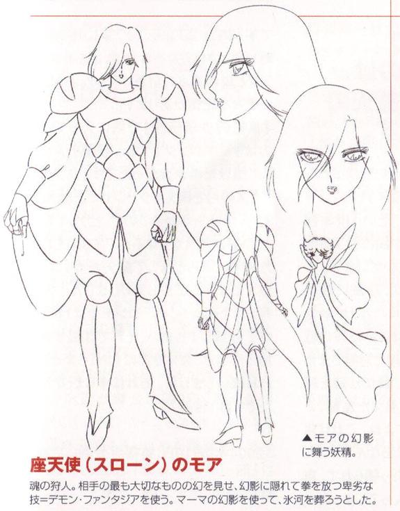 HABILIDADES ESPECIALES : Al igual que el Specter Myu de Papillon, el aura de Moa crea mariposas y hadas. Las primeras simbolizaban el alma para los griegos, que inicialmente está atrapada en el cuerpo, de la misma forma que al principio la mariposa es una prisionera de su crisálida y luego vuela como una mariposa. PERFIL PSICOLÓGICO : El Trono Moa aparece como un ángel muy hermoso y con rostro afeminado, que recuerda la naturaleza asexual de los ángeles. Es muy delicado y habla en un lenguaje sostenido. Lleva el apodo de "el cazador de almas", ya que es capaz de leer en el corazón de sus oponentes y usar en su contra sus sentimientos hacia sus seres queridos. No parece poseer una gran fuerza física y su poder se basa principalmente en sus ilusiones producidas con la técnica Demon Fantasia. Hyoga luchará contra él y deberá enfrentarse a la imagen de su madre. Desafortunadamente para Moa, el Cygnus Saint será capaz de ignorar sus sentimientos y desencadenar el ataque mortal Aurora Thunder contra el trono. A diferencia de los otros ángeles caídos, Moa es aparentemente muy tranquilo y prefiere los ataques a a distancia. Este Fallen Angel es, sin embargo, uno de los más crueles, no duda en manipular los recuerdos tiernos de sus contrincantes para colocarlos en una gran confusión mientras se burla de su impotencia. La manera de combatir de este personaje está inspirada por la del General Marina Kasa de Lyumnades, que también es apodado "el cazador de corazones", mientras que Moa lleva el título de "cazador de almas". PARTICULARIDADES DE LA ARMADURA : Fanart de Marco Albiero (Italia) La armadura tiene perneras que cubren hasta las rodillas, con dos rodilleras redondas. El peto se une con el cinturón, formando una coraza que imita a las armaduras medievales. Las hombreras son voluminosas, con forma de media esfera, y tienen una prolongación plana hacia el antebrazo. Los guanteletes son especialmente cortos, ya que solo cubren los puños. La armadura no tiene casco o quizás Moa no lo usa. Moa lleva como indumentaria adicional dos trozos de tela que le cuelgan de los brazos, para simular alas de insecto. ACCESORIOS :