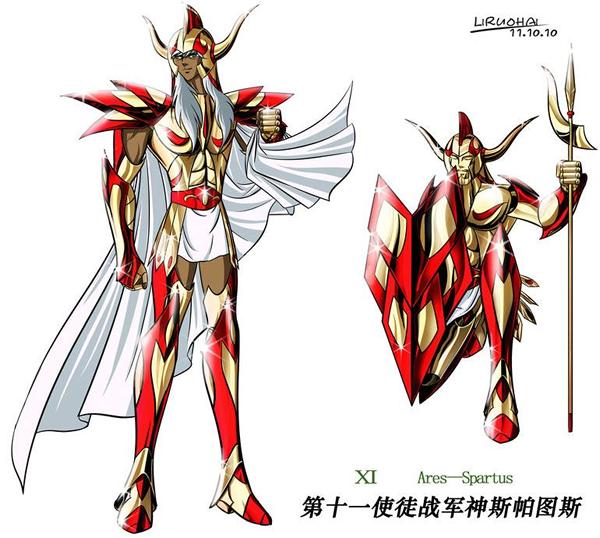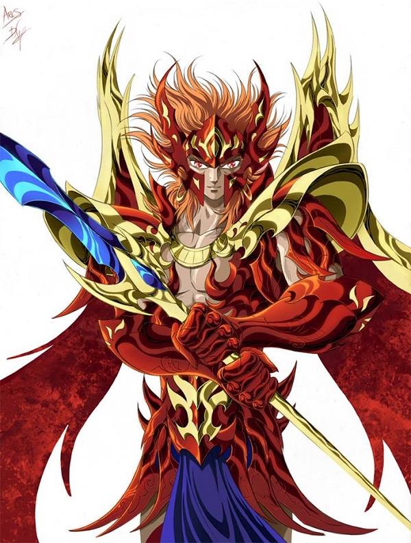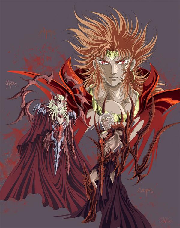 Fanart de Lady Heinstein (Colombia) En Saint Seiya G, Saga de Géminis se refiere a Ares cuando se pone un traje de Pontífice Version guerrera (el hábito de la capa roja de la serie de TV de 1986), y dice que será "aquel que es el extremo opuesto de Athena, el dios que crea violentos campos de batalla y que guía a los maléficos Phobos, Deimos, Keres y Kudomos: Ares ". No está claro si Saga simplemente se limita a enunciar la mitología, o si en el universo de Saint Seiya esos dioses están en realidad el servicio de Ares.