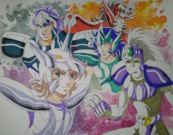 Fanart de Marco Albiero (Italia) Shiori Teshirogi confirmó a Tsubaki y Lacaille como Silver Saints (sus cloths son plateadas) y Rusk es un Bronze Saint. Ella también explicó que no uso a Carina porque apareció en los films.