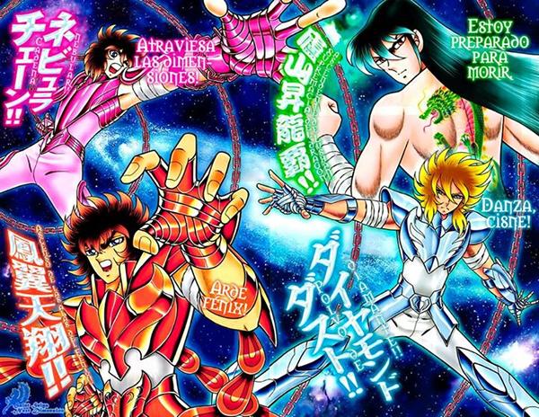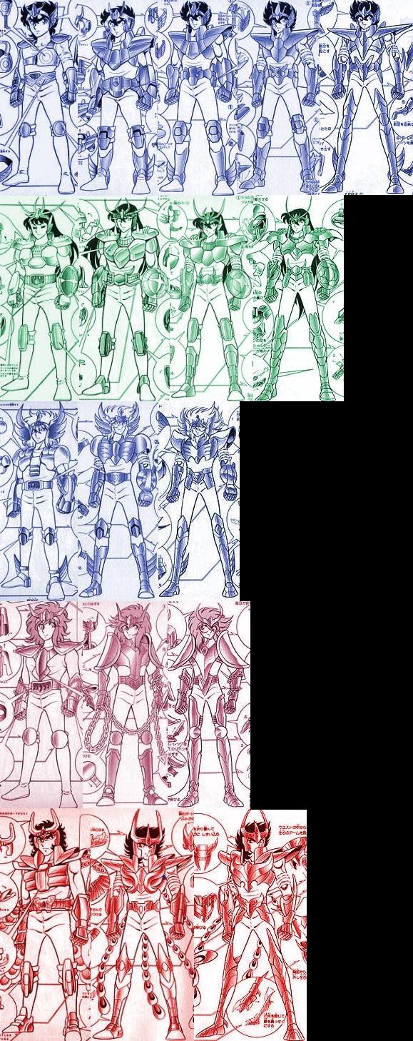 Colorizaciones - Fanarts de Raúl Estebanez (España) Los Bronze Cloths de Pegaso, Cisne y Fénix sí tienen alas. En la saga de Hades se ven las alas originales de sus armaduras. A pesar de la sorpresa de sus portadores, las alas de los cloths no son un secreto, la reacción de los protagonistas se debe a su desconocimiento, en los diagramas de Kurumada se pudieron ver dibujadas las alas... sólo que esas piezas se esconden al vestir el Cloth. Seiya menciona también que el ya sabía que el Pegasus Cloth tenía alas pero no sabía que tenían una función. Seguramente sólo funcionan para planear y controlar un salto muy alto hasta que alcanzan el estado pre-God Cloth, antes de eso, probablemente no son mas que ornamentos... Los Cloths otorgan un boost al Cosmo del Saint, se menciona una y otra vez en el manga de Kurumada, y cuando Seiya despierta su God Cloth es una de esas veces en que esto aparece claramente. Ese boost aumenta fuerza, vitalidad, velocidad y reflejos del Saint, Cosmo y Cloth operan en conjunto cuando un Saint pelea. No obstante, los Bronze Saints no pueden mantener el séptimo sentido despierto todo el tiempo, a diferencia de los Gold Saints, que sí pueden. Lo que significa que sus ataques, aun vistiendo un God Cloth, sólo alcanzan la velocidad de la luz cuando ellos hacen que su Cosmo arda más allá de su límite. El hecho de haber despertado el God Cloth no significa que haya que mantener el Cosmo más allá del límite todo el tiempo, sino, un Bronze Saint no podría tener despierto el God Cloth más de unos cuantos minutos. El Bronze Saint debe hacer que su Cosmo arda más allá de su límite cada vez que quiera un ataque a la velocidad de la luz, aunque ya tenga despierto el God Cloth. Obviamente, esto sería diferente para un Gold Saint con God Cloth... él podría tener ataques a la velocidad luz todo el tiempo. Un Bronze Saint no. Los God Cloths poseen un poder y majestuosidad que los hace cercanos a los Kamui カムイ nombre que designa a los ropajes sagrados que poseen sólo los 12 dioses Olímpicos, también llamados 神衣 (Kami Koromo) “Vestiduras de Dios”. Son las armaduras más fuertes del Universo, siendo más fuertes que los God Cloth. Cubren prácticamente todo el cuerpo y su belleza es muy superior a la de otras categorías de Cloths. Los God Cloths surgen de las cenizas de los Bronze Cloths, que habían sucumbido ante el poder del dios Thanatos, las cuales, según sus propias palabras, emanan una sorprendente aura de divinidad. El dios Hypnos explica que los Cloths bañados en sangre divina terminan adquiriendo el poder casi ilimitado de los Kamui. Es tal el poder que confieren los God Cloths a sus portadores, que estos dejan de ser humanos ordinarios, adquiriendo un poder potencialmente letal aun para los dioses.