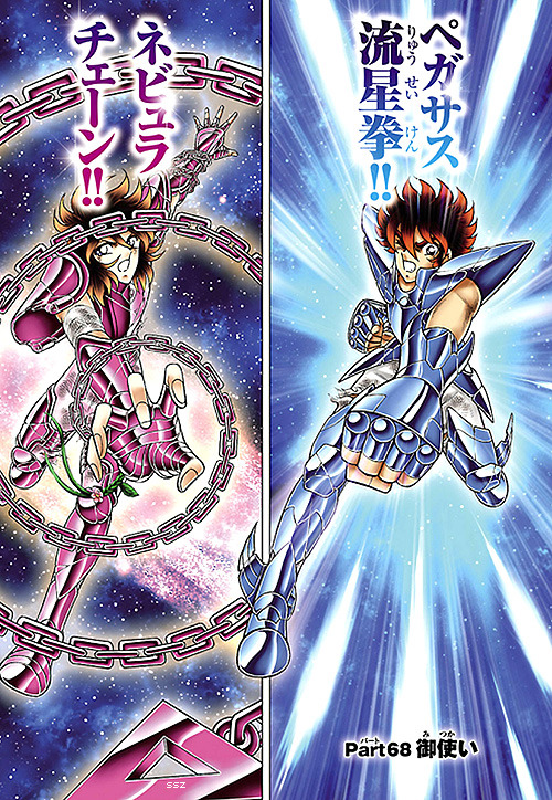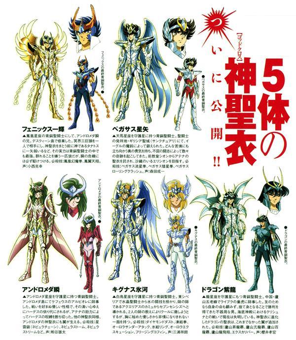 koto ha jōshiki... O sea: "Así es... es del conocimiento general que la velocidad del sonido es 340 metros por segundo... En otras palabras, si asumimos que el enemigo está a 3.4 mts de distancia, esto significa que él recibiría 100 golpes en un segundo" Aiolia y Shaina lo explican más adelante de una forma muy similar. God Cloth ゴッドクロス (Goddo Kurosu) “Ropaje divino”. Según Kurumada los ideogramas representativos son 神聖衣 (Kami Seii o Shinsei Koromo) “Vestimenta Divina”, no obstante su lectura debe ser Goddo Kurosu según el deseo del autor. Se llama así a la máxima evolución o nivel final que puede poseer el Cloth de un Saint de Athena. Muy raras veces han aparecido durante las eras. Los caballeros de bronce protagonistas obtuvieron las denominadas God Cloths o Cloths más poderosas solamente en los capítulos finales del manga. No son utilizadas comúnmente por Saints, aparecen sólo raramente y bajo ciertas condiciones. En este caso particular, eran armaduras de bronce realzadas por la sangre y el Cosmo de Atenea. Así se convirtieron en God Cloths, casi tan poderosas como las armaduras de los dioses (Kamui). Hasta ahora, Kurumada ha mostrado el estado God Cloth sólo en los Bronze Cloths.