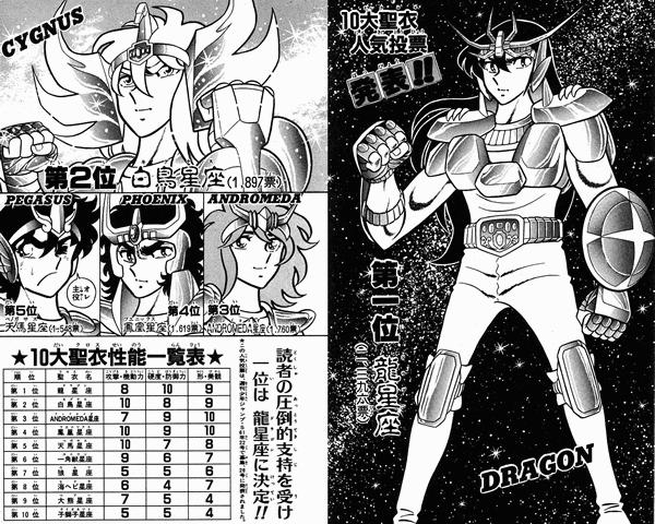 Shiryu (2396 votos) Kurumada manifestó que hay veces que los héroes o protagonistas que dibuja no son populares, son menos apreciados que otros personajes secundarios. Seiya no fue la excepción, perdía popularidad en detrimento de Shiryū, Hyōga, Shun e Ikki. Ciertamente en los mangas nekketsu el principal antagonista rivaliza en popularidad con el protagonista, pero en los mangas de Kurumada el héroe principal está ayudado por chicos físicamente atractivos que le quitan rápidamente el puesto. Se produce uns situación similar a la de un grupo de rock donde el cantante principal no es nada popular y el público alaba únicamente a los tipos que tocan la guitarra o la batería.