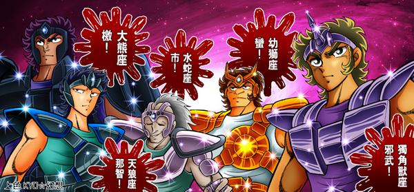 Guerra Galáctica 10 Bronze Saints participaron en el Galaxian Wars. Jabu de Unicornio (H) venció a Ban de León Menor (G), pero luego fue derrotado por Shun de Andrómeda (F). Shun alcanzaría la semifinal contra el Ikki de Fénix (J) que venció a Nachi de Lobo (I). En el otro lado del cuadro, Seiya de Pegaso (C) derrotó a Geki de Oso (D) y luego a Shiryu de Dragón (E). En la semifinal se enfrentaría a Hyoga de Cisne (A) que a su vez venció a Ichi de Hidra (B), sin embargo el torneo fue interrumpido por la invasión de Ikki de Fénix y de los Black Saints, que robaron el Gold Cloth de Sagitario En el manga, se reveló que los 100 huérfanos en realidad eran medio hermanos, con su padre siendo Mitsumasa Kido, el hombre al que han despreciado durante su crecimiento por arrancarlos de sus felices hogares. Seiya no estaba especialmente contentos de oír esa noticia, e incluso participa en diversas batallas sangrientas con la esperanza de "limpiar" su cuerpo de la sangre de Kido.