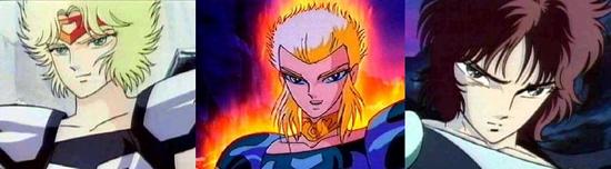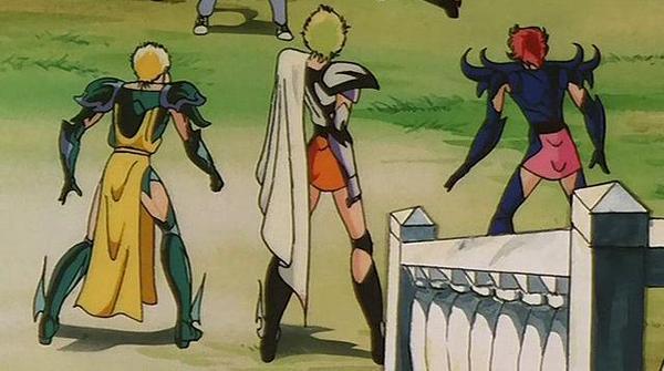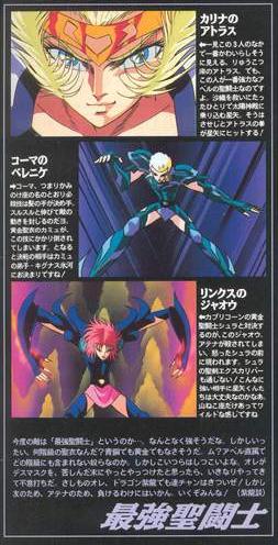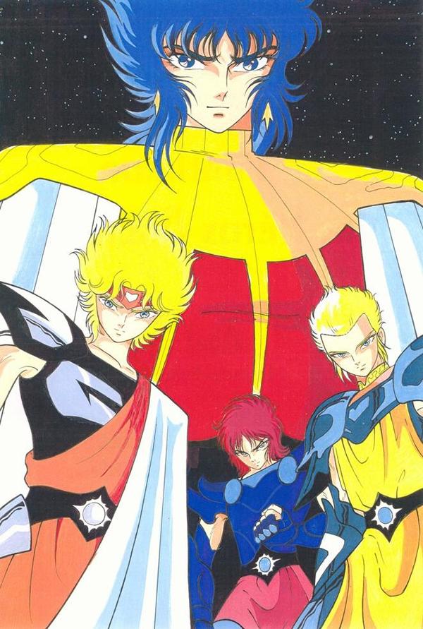 Algunas imágenes fueron difundidas en el pamphlet del film pero luego no fueron utilizadas. Originalmente, todos los Corona Saints iban a usar armaduras de colores rojo y blanco, probablemente para enfatizar y subrayar su relación con el Sol (hay que recordar que los Gods Warriors de la segunda película también tuvieron colores no definitivos en un trailer). El hecho de que en las imágenes promocionales Belenger esté en el centro y tenga una armadura predominantemente blanca en comparación con las de sus compañeros, de un color naranja más uniforme, sugiere que podría ser el líder en la primera versión. Estas imágenes son de la promoción japonesa de la oav. En su primera versión los guerreros de la corona tenían sus armaduras blancas y naranjas.