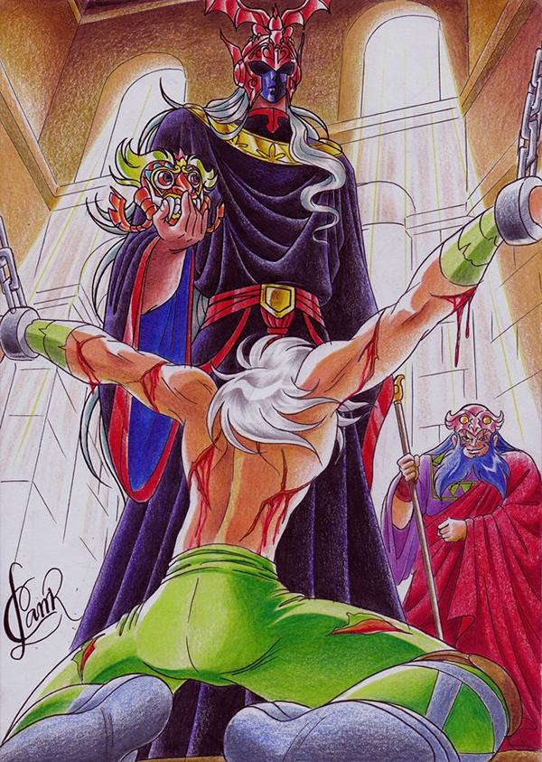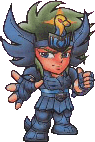Fanarts combinados de Trident (Bélgica) y Juan Carlos Brito (Rep. Dominicana) ACCESORIOS : Ninguno en particular. AURA : Kurumada nunca dibujó nada ni relacionó ningún simbolismo con este personaje en su manga. CONSTELACIÓN : Desconocida. HERENCIA MITOLÓGICA : Ninguna en particular. CURIOSIDADES : Ninguna en particular.
