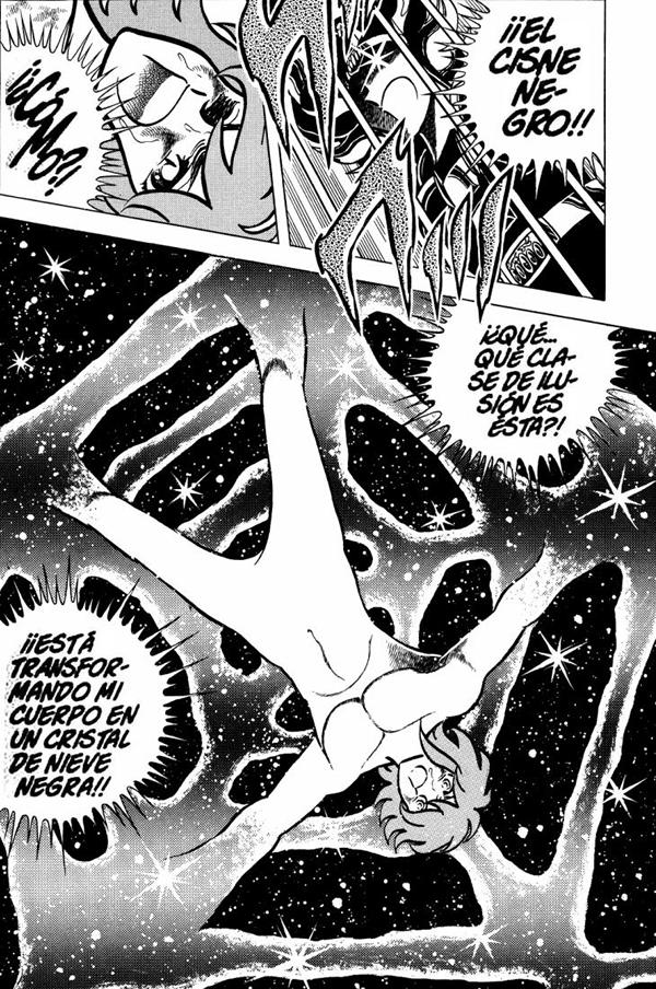 Primero, el Black Swan toma a Shun del cuello y es entonces que pareciera que Shun se convierte en un cristal de nieve, pero... Shun mismo menciona "estoy alucinando" y en ese momento aparece Hyōga. Kurumada dibujó en al menos dos paneles a Shun colgando de cabeza luego de que Hyōga llega y cuando este incapacita al Black Swan un momento, Shun cae al suelo. También, el Black Swan menciona que Hyōga cambia su nieve de negra a blanca. Shun estaba atrapado en una especie de congelación que tenía inmovilizados sus brazos y piernas, pero luego cae al suelo desde cierta altura. Hay un panel específico en que Kurumada lo dibujó estrellando su cabeza al suelo. Esto claramente muestra que estaba atrapado. Es algo parecido a cuando Hyōga le congela los pies a Scorpio Milo. Y finalmente, luego de que se levanta, Shun se pasa el resto del combate con un brazo sobre su hombro, adolorido. Es decir, sufrió algo de daño físico. Una ilusión no le iba a causar dolor. Lo único raro es que cuando está en el cristal de nieve, Kurumada dibujó a Shun desnudo, pero luego al caer tiene su ropa de nuevo. Esto es claro que lo hizo de una manera meramente ilustrativa, como un recurso visual, porque si no, Shun no habría estado un momento colgado y después haber caído en el suelo. HABILIDADES ESPECIALES : Ninguna en particular.