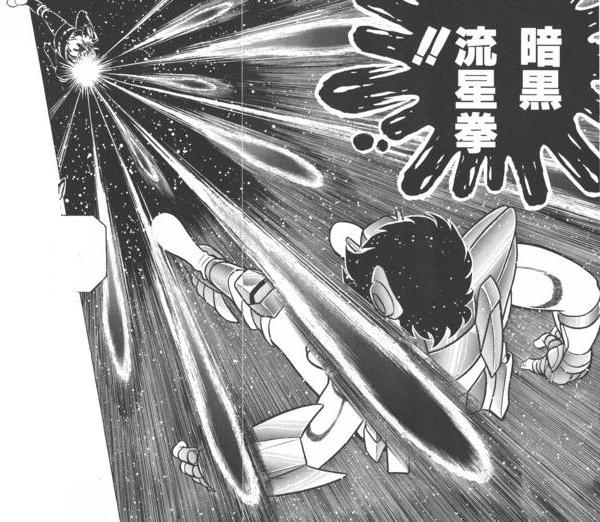 no indicado TÉCNICAS DE COMBATE : - Ankoku Ryusei Ken (Anime) o Black Ryûseiken (Manga) (暗黒流星拳, ブラック流星拳), → (あんこくりゅうせいけん) Burakku Ryuseiken, “El Puño Meteoro Oscuro” / “Meteoros Negros” / "Ataque de los meteoros negros" / "meteoros de las tinieblas") también llamado Black Death Punch /別名:黒死拳 (Kokushi-ken). Cabe señalar que la pronunciación utilizada para 黒暗 es la japonesa (Ankoku, tinieblas), mientras que el manga especifica que se debe decir "Black". - Kokushi Ken / Kokushiken. 黒死拳 → (こくしけん) “El Puño de la Muerte Negra” / “La Muerte Negra” / "Puñetazos meteoro negros" / "Puño/golpe de la muerte negra". Otra forma del manga para el apodo del Black Ryūsei Ken. - Dark Ryusei Ken (暗黒流星拳 - (あんこくりゅうせいけん), Ankoku Ryuseiken) se ha traducido habitualmente como “La Muerte Púrpura”, no obstante, sin traducción sería la Black Death o “La Muerte Negra”. En el doblaje de la versión inglesa se lo llama “The Black Meteor” literalmente “El Meteoro Negro”. Otra forma del anime para el apodo del Black Ryūsei Ken. - Kurojin no Kyōfu. 黒人の 恐怖 → (くろじんのきょうふ) “El Terror Negro”. En el doblaje de la versión inglesa lo llaman “Black Terror” el terror negro. - Black Ryū Sei Ken - Ankoku Suisei Ken (Anime) 暗黒彗星拳 → (あんこくすいせいけん) "El Puño Cometa Oscuro". Es curioso notar pero en la versión original animada antes de morir el último golpe de Pegaso Negro fue esta técnica. Su meteoro se unifica en un solo rayo.